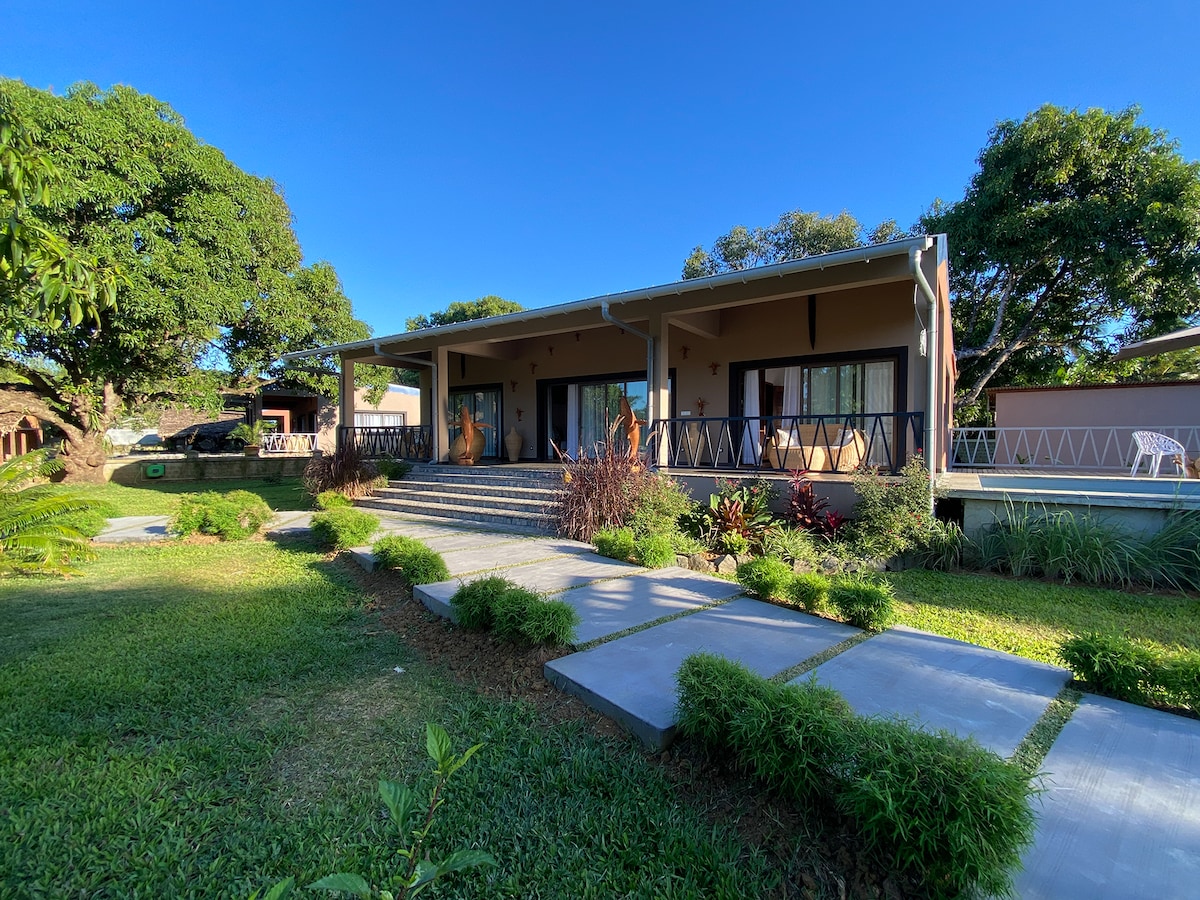 VILLA DE PRESTIGE, 200m² Tout confort AVEC PERSONNEL DE MAISON A DISPOSITION EN JOURNEE Le Paradis vous attend A proximité de tout Levers et couchers de soleil depuis vos terrasses panoramiques Position dominante avec vue sur l'Océan Indien, côtes Est & Ouest. Piscine, jacuzzi, vélo de sport, parc tropical 3000m² Cuisine intérieure et extérieure, barbecue et brasero 7 mns à pied du lagon avec double barrière de corail. Secteur privilégié très recherché Activités touristiques à proximité.