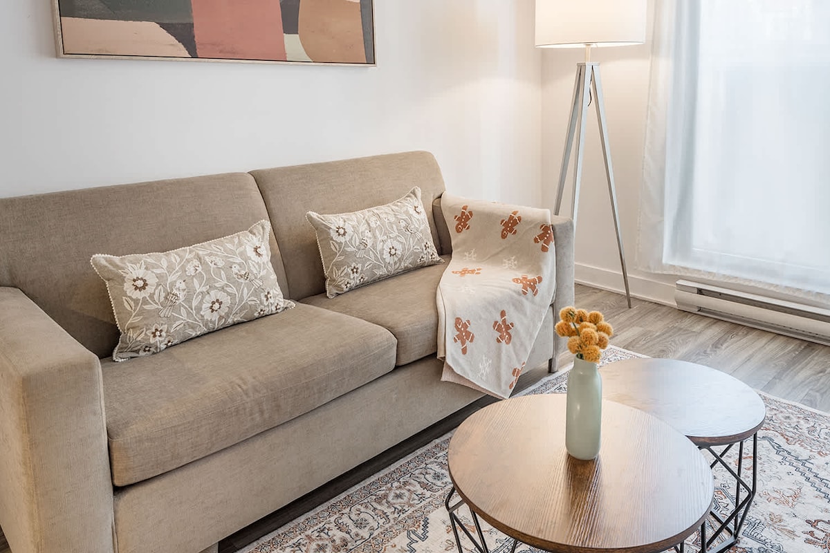 The Reverie is a luxurious, fully equipped 1-bedroom + 2-sofabeds condo at the heart of the Vieux-Port. Steps to Notre-Dame Basilica, Palais des Congrès, Bota Bota, Igloofest, the waterfront, top restaurants and bars. Family-friendly and pet-friendly—ideal for winter holidays, Christmas break, congress stays, 5@7s, dinner parties, or New Year’s Eve. Parking, amenities and public transport nearby, with extra services available. Laurie, your 5-star superhost, is here to make your trip memorable.