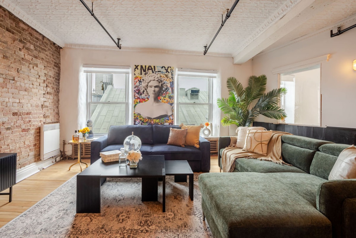 Stunning Old Port penthouse combining historic charm with sleek modern design. Sleeps 8 across one private bedroom and two stylish lofted rooms, each with tall partitions and locking doors. Soaring ceilings, exposed brick, and warm, elegant finishes throughout. Enjoy a chef’s kitchen, 65" HDTV & projector for movie nights, a gaming nook, and a compact office space. Steps from Montreal’s best dining, shops, and culture.