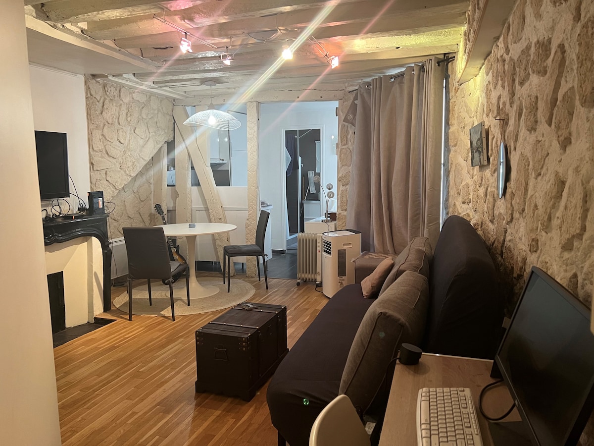 ==Only guests with reviews from previous hosts can book this place== When staying here you can sense the history of the place. This vacation apartment is situated in a 17th-century stone building a listed heritage site, nestled on a pedestrian alley in the Marais district. Visitors will be surprised by how sophisticated, yet rustic and full of charm the space is. It is very comfortable with all the modern amenities.