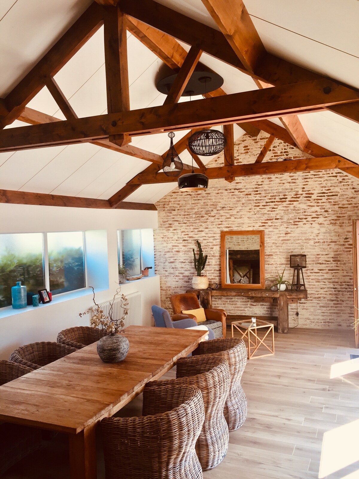 Votre histoire dans l'Histoire. Venez séjourner au deuxième étage du manoir dans un élégant appartement de 65m2. Cet appartement bénéficie d'une vue dégagée sur la campagne environnante, sa décoration épurée appelle au calme et au repos. La pièce de vie offre un salon confortable et une table à manger, la cuisine est équipée, la salle de douche spacieuse et agréable. Il y a deux chambres, équipées chacune d’un lit Queen size de qualité hôtelière.