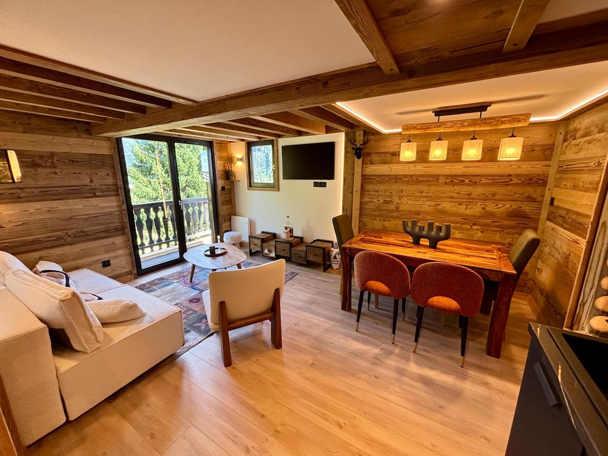 Add logs to a fireplace with a massive stone hearth and recline on a rustic wooden sofa. Gaze through picture windows at the alpine forest surrounding an authentic chalet. Return from the slopes and unwind in a luxury sauna in a cabin-chic bathroom. Une chambre de 25m2 avec lit double, rangements, armoire authentique. Un salon chaleureux et spacieux avec double baies vitrées donnant sur le Mt Blanc et cheminée. Et un sofa banquette convertible en 2 lits individuels. Cuisine pratique et toute équipée. Une salle de bain en granit avec douche et sauna 3 personnes. Une terrasse devant forêt et ruisseau ( avec fréquente visite des biches - voir photos ), avec fontaine et vue imprenable sur le massif du Mt Blanc. The chalet is an individual construction fully available and reserved for the guests. So are the terrace and the surroundings ( a small river, a private bridge and access to the forest ). A disposition pour toute question. Dans le hameau de Coupeau : Chalet authentique dans la forêt au-dessus des Houches avec vue exceptionnelle sur le massif du Mont Blanc. En Bord de petit torrent avec des biches A 5 min en voiture des Houches, à 10 min de Chamonix, à 1h de Genève. Easy access by road to the chalet. 2 kms from Les Houches and 10 kms from Chamonix. Parking just behind the chalet A fully renovated old chalet. With all modern comfort ( inc Sauna for 3 ) and top decoration. A unique view on the MontBlanc chain. The chalet is in the hamlet of Coupeau, in the forest above Les Houches, with exceptional views of Mont Blanc. It's a 5-minute drive to Les Houches, 10 minutes to Chamonix, and an hour to Geneva.