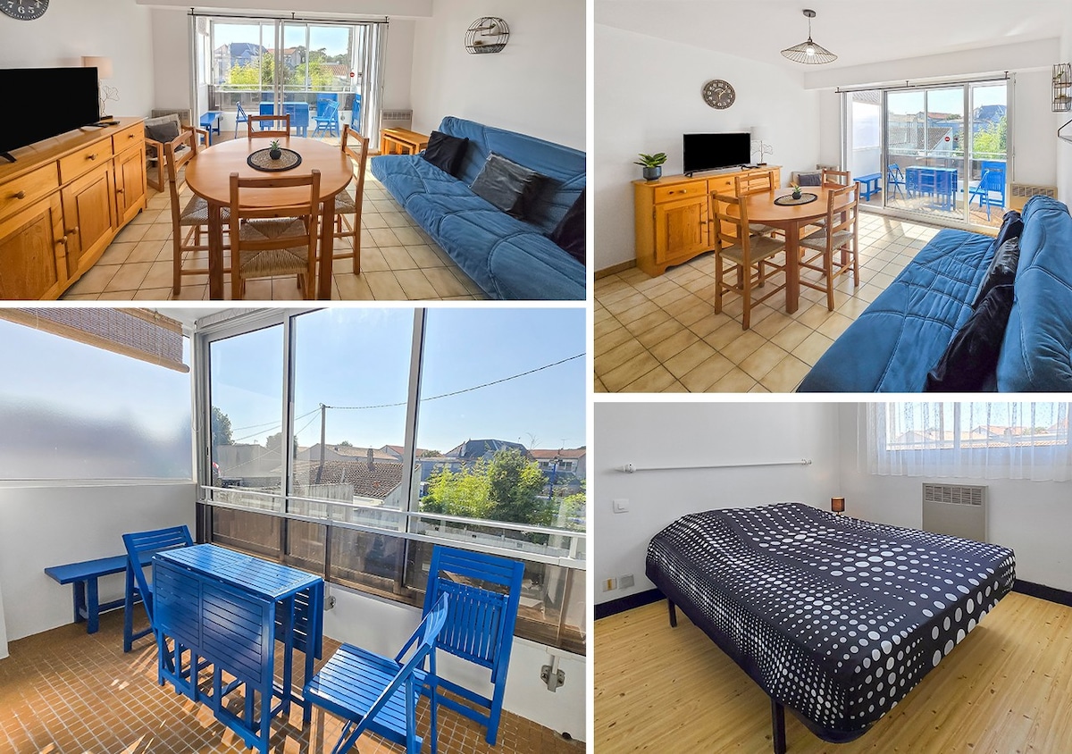 appartement non fumeur de 37m, balcon avec vue sur piscine 1 chambre séparée avec 1 lit double de 160×200 et un grand placard , salon avec canapé lit, cuisine équipée, wc séparé. 1 caution de 80€ pour le ménage sera demandé à votre arrivée Petits animaux de compagnies acceptés 50 € la semaine sur demande. linge de maison fournie (drap housse, housse couette,serviette de toilette) 50€ la semaine. Adresse : 6 Chemin du petit sochard 85160 saint jean de monts Résidence resid azur