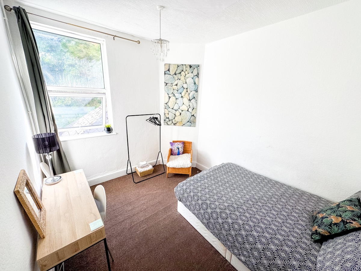 3 bedrooms, slipper bathroom plus large walk in shower room & downstairs toilet Entire use of house. Quiet cul-de-sac Off road parking - 2 cars 15 mins walk to town centre 20 mins back-steep hill. Additional shops 5 mins walk. countryside walks from door step 10 minute drive to Derbyshire dales Small garden conservatory furniture outdoor table and chairs on patio. Lockable shed-store bikes/canoes Fully equipped kitchen Newly renovated & decorated to high standard. Fresh linen & towels provided