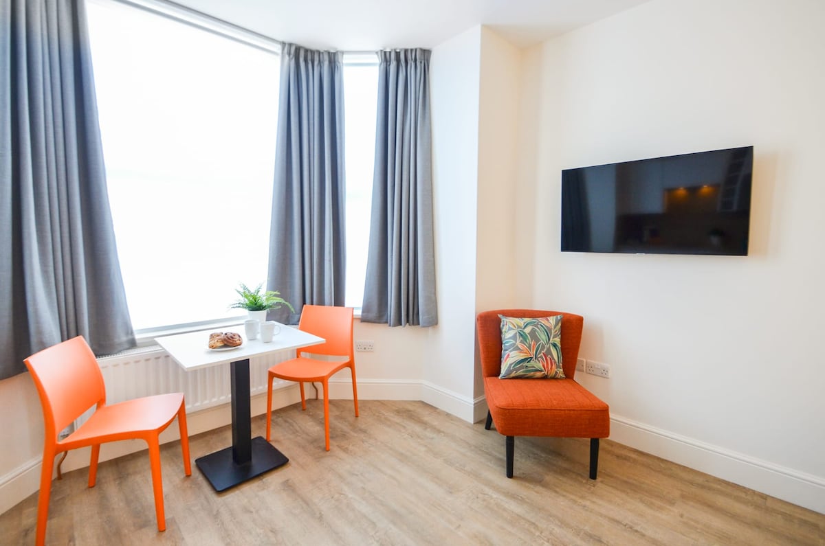 Conveniently located on the ground floor, our classic single room offers stunning views of St. Mary’s Church. Designed for comfort and accessibility, it features a flat-screen TV, a versatile desk and chair for work or vanity use, and beautiful sash windows with bespoke shutters for privacy and natural light. The fully accessible en-suite bathroom ensures ease of use for wheelchair users, with warm-tone brass finishes and luxury toiletries for a premium experience.