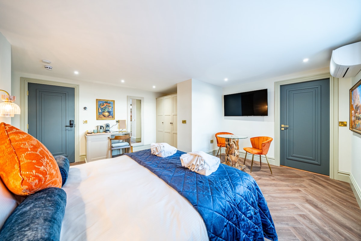 Decorated in vibrant natural tones, this spacious room features a luxurious king-size bed, wardrobes, and a flat-screen TV for relaxation. A desk or dressing table with a chair serves as a workstation or vanity. Sash windows with bespoke shutters offer privacy while inviting natural light. The en-suite bathroom is a haven of indulgence, boasting a walk-in rainfall shower with warm brass finishes and luxury toiletries for a spa-like experience.