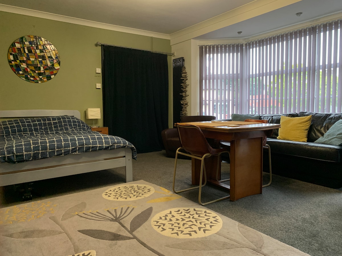 A spacious lounge with double bed and large leather sofa, chairs. HD TV & a Bose Bluetooth music speaker. The Studio is private and totally separate from the main house. Own Small Kitchen with Sink, Fridge, Twin Hotplates and a Microwave Oven. Shower and Toilet with Hand Wash Basin. The Studio is a 10 minute bus ride from the city centre but in a quiet leafy area and is only a five minute walk from Wollaton Park. Private off road parking is provided for guests right next to the studio entrance.