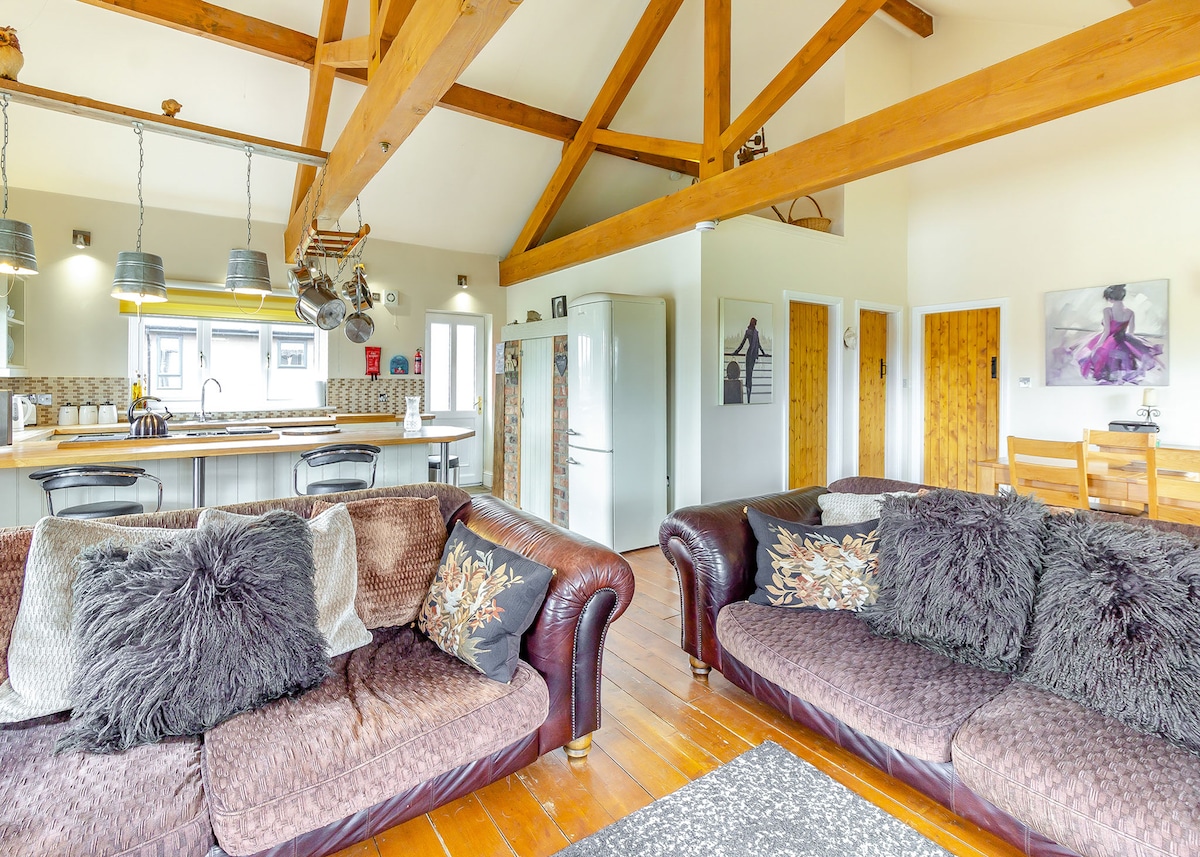 Modern lodge with open-plan living/kitchen/dining area with direct access onto a front decking with bistro set overlooking the fishing lake.
