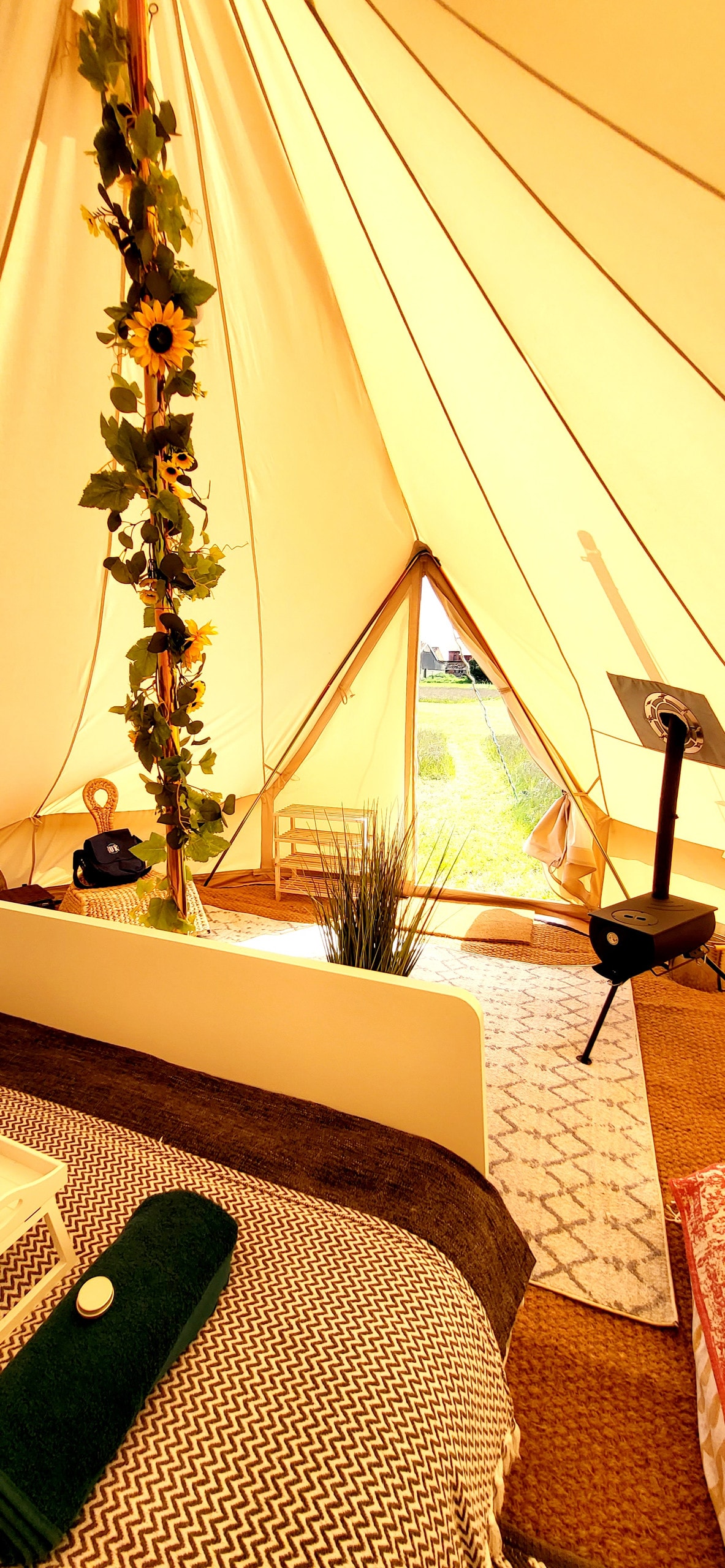 A beautifully styled 5-metre bell tent, The Emperor is designed to comfortably sleep up to 3 guests. Inside, you’ll find a plush double bed and a sofa bed, dressed with soft linens and warm throws to ensure a restful night’s sleep. Thoughtfully decorated in earthy greens and soft neutral tones, the interior blends natural textures with ambient lighting to create a peaceful, nature-inspired escape. Whether you're a couple looking for a romantic getaway or a small group wanting to unwind.