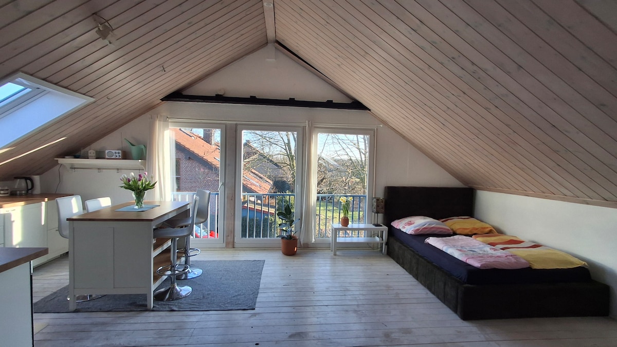 Eine besondere Unterkunft im Loftcharakter. Ein mit viel Liebe zum Detail gestaltetes Loft mit Doppelbett&Schlafcouch für 3 -4 Personen. Ein großzügiges Badezimmer mit Badewanne/Dusche. Offener Raum mit Küche zur Selbstversorgung. Privater Außenbereich mit Tisch und Gartencouch. Trotz geteilten Grundstück mit einem historischen Haus komplette Unabhängigkeit und Privatsphäre. Für Naturliebhaber ein perfekter Rückzugsort am Waldrand. 8 min zum Baldeneysee. ÖV (5 min zum Bus/14 min S-Bahn)