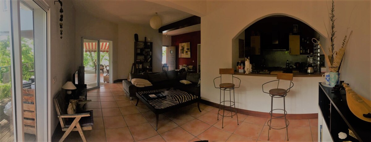 Logement standing = à 3 épis, rez de jardin à la déco tropicale est aménagé pour l'accueil d'une famille avec un jeune enfant : jardin clos, plantation sans épines. Vous pourrez vous délasser sur la terrasse avec en fond sonore le chant des oiseaux.