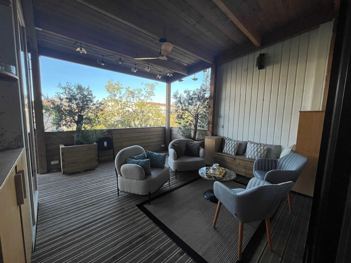 Nous serons ravis de vous accueillir chez nous dans notre habitation atypique (ancien garage rénové en loft) en plein centre-ville au calme et sans vis-à-vis. Un studio de plain pied avec entrée indépendante vous attendra: - terrasse rez de chaussée avec BBQ - terrasse en hauteur avec bains de soleil (magnifique vue) - grande chambre avec coin salon - petite cuisine - grande salle d'eau avec douche à l'italienne - superette à 100m - tout le rez de chaussée est accessible handicapé