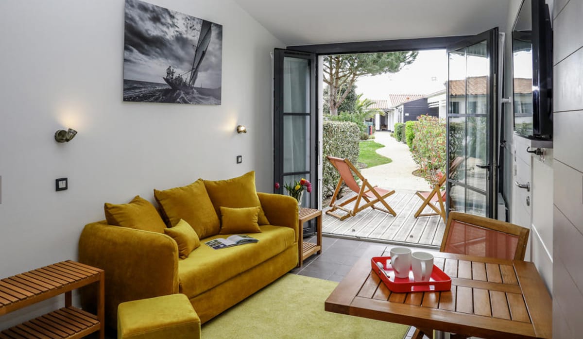 Loggia - 2 chambres pour 4 personnes Dans ce logement rénové en 2023 de 40m2, vous bénéficiez de : 1 chambre avec lit de 140cm 1 chambres avec 2 lits jumeaux de 70cm 1 salle de bain 1 cuisine tout aménagée (lave vaisselle, plaques de cuisson, cafetière senseo, micro-ondes, bouilloire, aspirateur sans fil) 1 salon avec TV 1 terrasse couverte avec salon de jardin Les draps sont inclus pour les séjours de 7 nuits minimum. Accès à toutes les infrastructures du camping, piscine, bar le Spot.