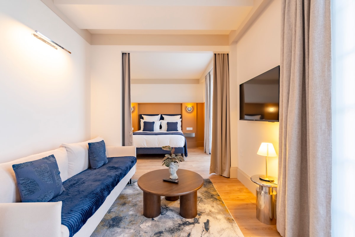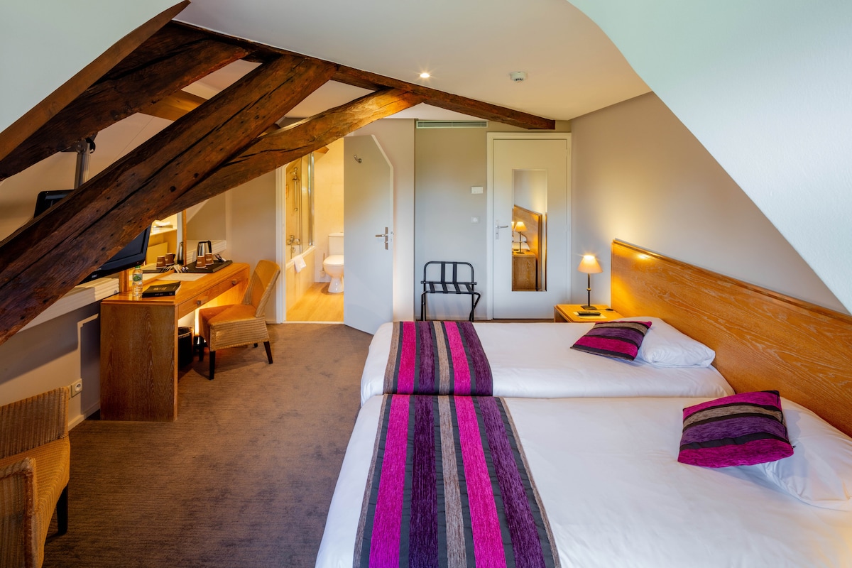 Discover the Deluxe rooms at the Champlain Hotel and let yourself be charmed by their serene atmosphere. Spacious (approximately 20m²) and bright, they offer a view of our flower garden and are the ideal place to relax. Their refined décor is sure to charm you. Equipped with king-size beds, air conditioning and double glazing, they guarantee peace and relaxation. The hotel is located just 5 minutes from the old port of La Rochelle.