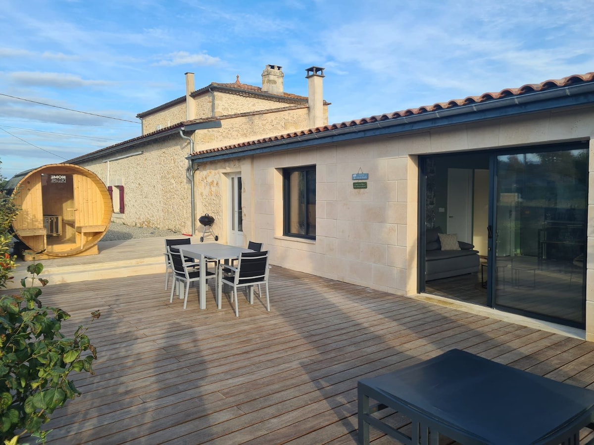 Notre gîte, au milieu des vignes avec sauna et jacuzzi privatif se compose d'une grande pièce de vie avec cuisine tout équipée (cafetière nescafé et dosettes fournies),d'un canapé lit, une salle d'eau ainsi qu'une grande chambre avec un lit 160×200. Vous pourrez également profiter d'une grande terrasse dominant le vignoble. Une pergola bioclimatique vous permet de vous détendre dans le jacuzzi toute l'année. Un sauna tonneau est aussi à disposition sur la terrasse.