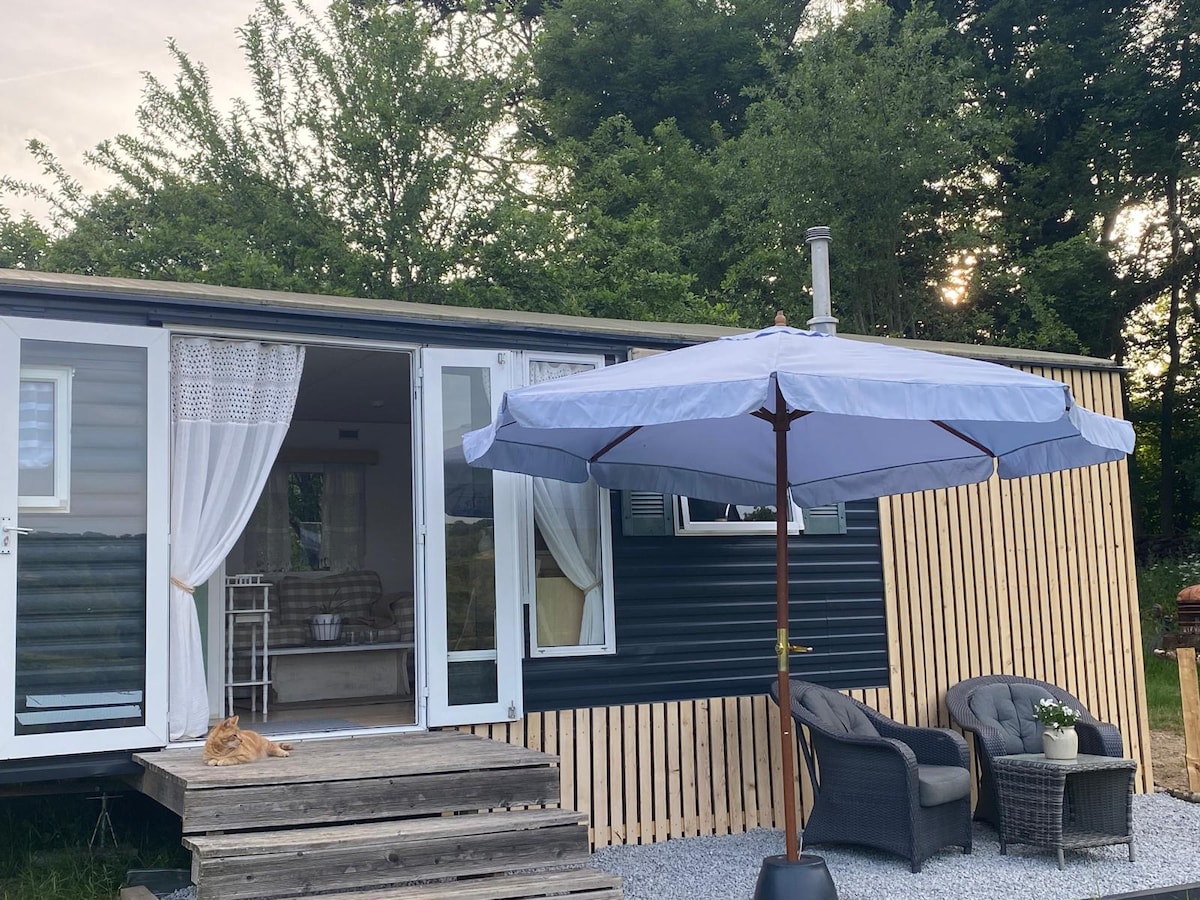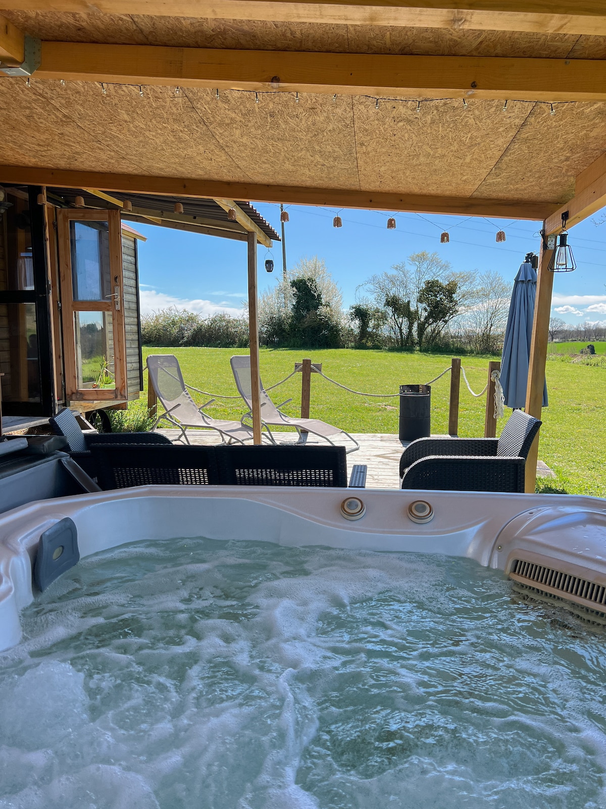 Das Roulotte ist ein brandneues, gemütliches kleines Holzhaus auf Rädern, das in diesem Jahr komplett neu aufgebaut wurde. Es wurde mit viel Liebe zum Detail gestaltet und eingerichtet, um seinen Gästen einen ruhigen und erholsamen Aufenthalt zu bieten. Das Roulotte ist perfekt für Paare oder Alleinreisende, die dem Alltagsstress entfliehen und sich inmitten der Natur entspannen möchten. Auf der Terrasse können Sie sich im privaten Whirlpool entspannen und den Blick auf die Sterne genießen