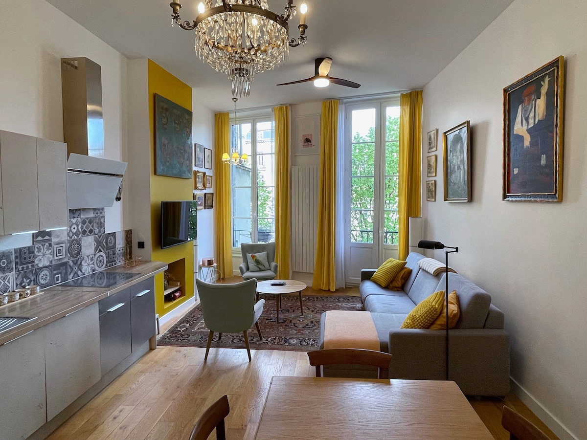 Nous vous invitons à venir découvrir ce bel appartement de 60m2, idéal pour 2 ou 3 voyageurs. Situé au coeur historique de Bordeaux, il allie le charme de l'ancien (parquets, belle hauteur sous plafond, joli balcon) au confort du moderne (cuisine équipée, ascenseur). La chambre spacieuse donne sur une cour intérieure, la SDB est entièrement rénovée avec une douche confortable et spacieuse. le séjour est agrémentée d'une cuisine entièrement équipée. Le salon s'ouvre sur un joli balcon.