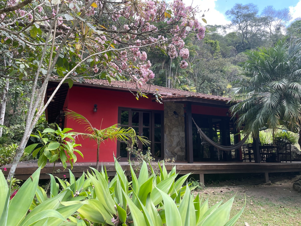 Venha se encantar e descansar junto à natureza em Rio Bonito de Lumiar. Paz e total privacidade num jardim de sonhos. Piscina de água corrente, churrasqueira e sauna seca exclusivas para você. Casa bem equipada - cozinha completa, toalhas e roupas de cama impecáveis, Internet rápida, TV smart e banho a gás. Perto da vila onde há comércio e opções para comer e beber. Recebemos 1 cão médio ou até 2 pequenos. Massagem, Aulas de Yoga ou Pilates e Banho de Floresta mediante consulta e agendamento.