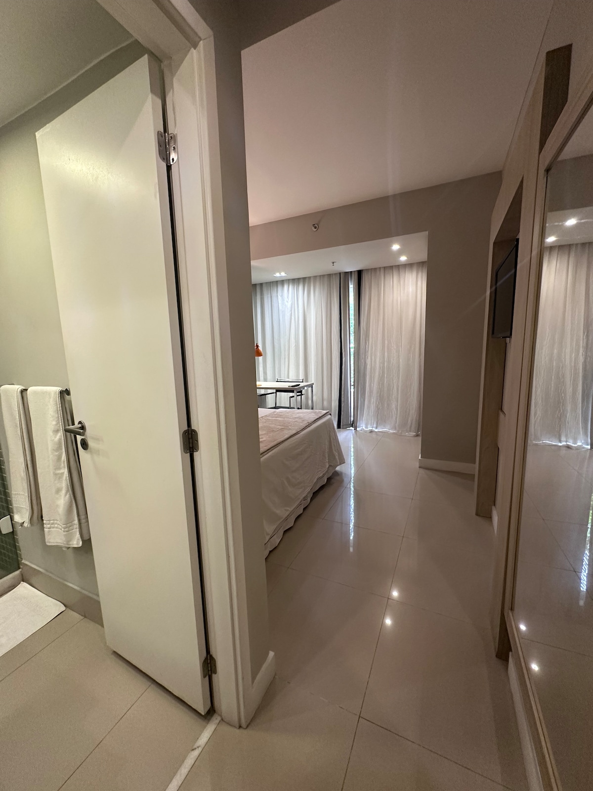 Ampla e confortável suíte com varanda, cozinha completa, uma cama e um sofá cama para casal, ótima localização no bairro da Barra da Tijuca, serviços de hotel, limpeza, arrumação, restaurante com serviço de quarto, segurança, estacionamento diária R$ 15,00, acesso à Praia da Reserva de balsa pela lagoa , clube em frente com academia e piscinas, tudo incluso na hospedagem, fácil acesso aos shoppings Vogue Square, Rio Design e Millennium, com diversas lojas e restaurantes.