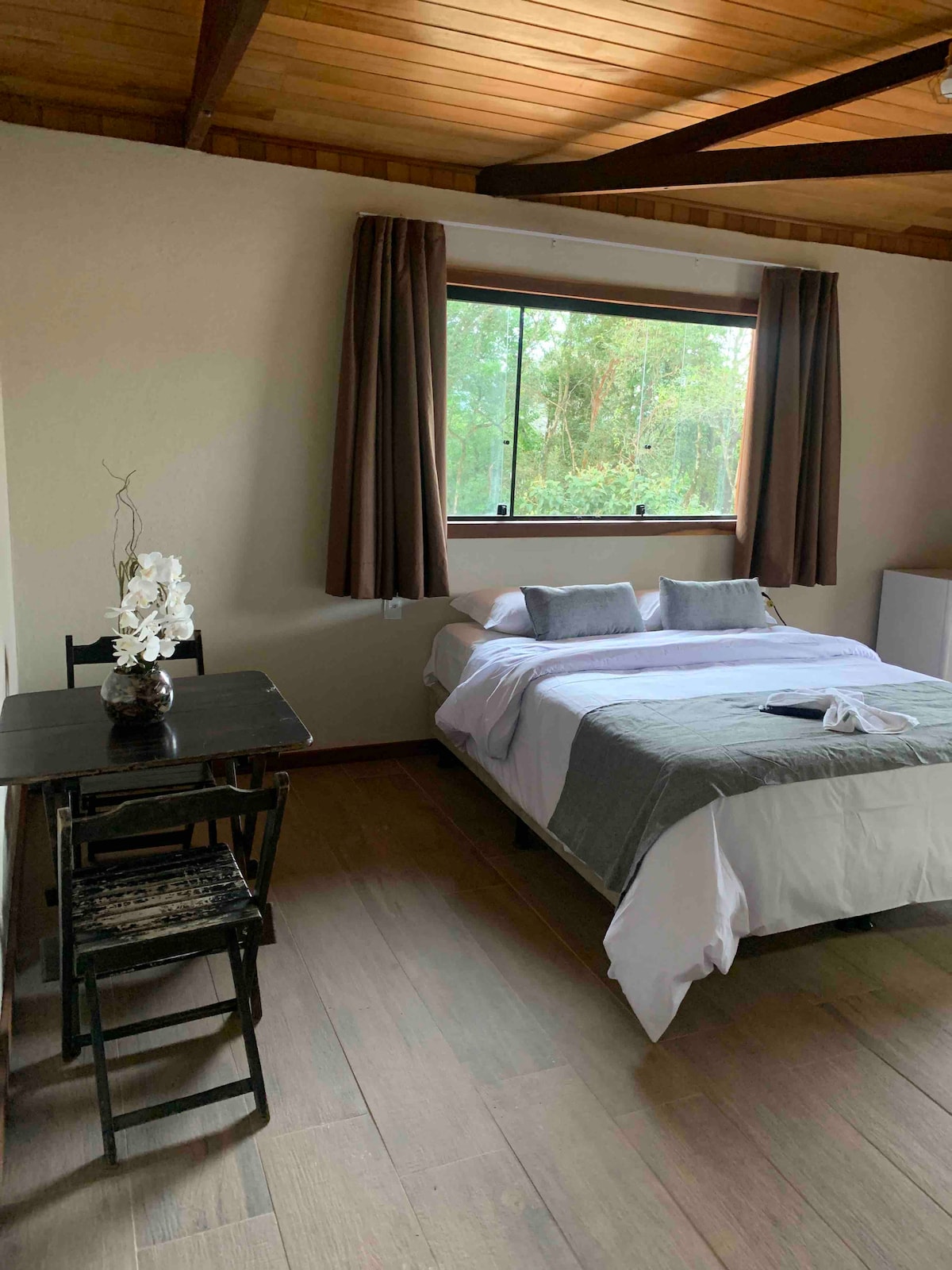 Nossos aptos possuem banheiro privativo com box de blindex, sacada com vista para mata, TV de tela plana, cama box, Wi-Fi, frigobar e ventilador de teto. Possuem sacada ou janela com linda vista para as matas, TV de tela plana com canais abertos, frigobar e ventilador de teto. O banheiro privativo é revestido com cerâmica espanhola, o box é de blindex e a ducha tem aquecimento solar. As camas são do tipo box com roupas de cama de puro algodão. Além da cama de casal tamanho Queen, pode haver uma.