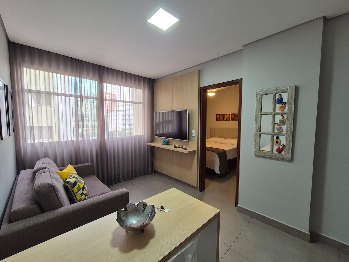 Apartamento novo, bem ventilado, bem equipado, uma vaga de garagem coberta, com elevador! Localizado no quarteirão fechado da Praça da Savassi, fácil acesso ao centro da cidade, próximo ao Shopping Pátio Savassi e demais comércios. Foi mobiliado recentemente para hospedar clientes exigentes e de bom gosto! 120Mg de Wi-fi. Um pequeno apartamento com uma sala, cozinha conjugada e suite com closet.