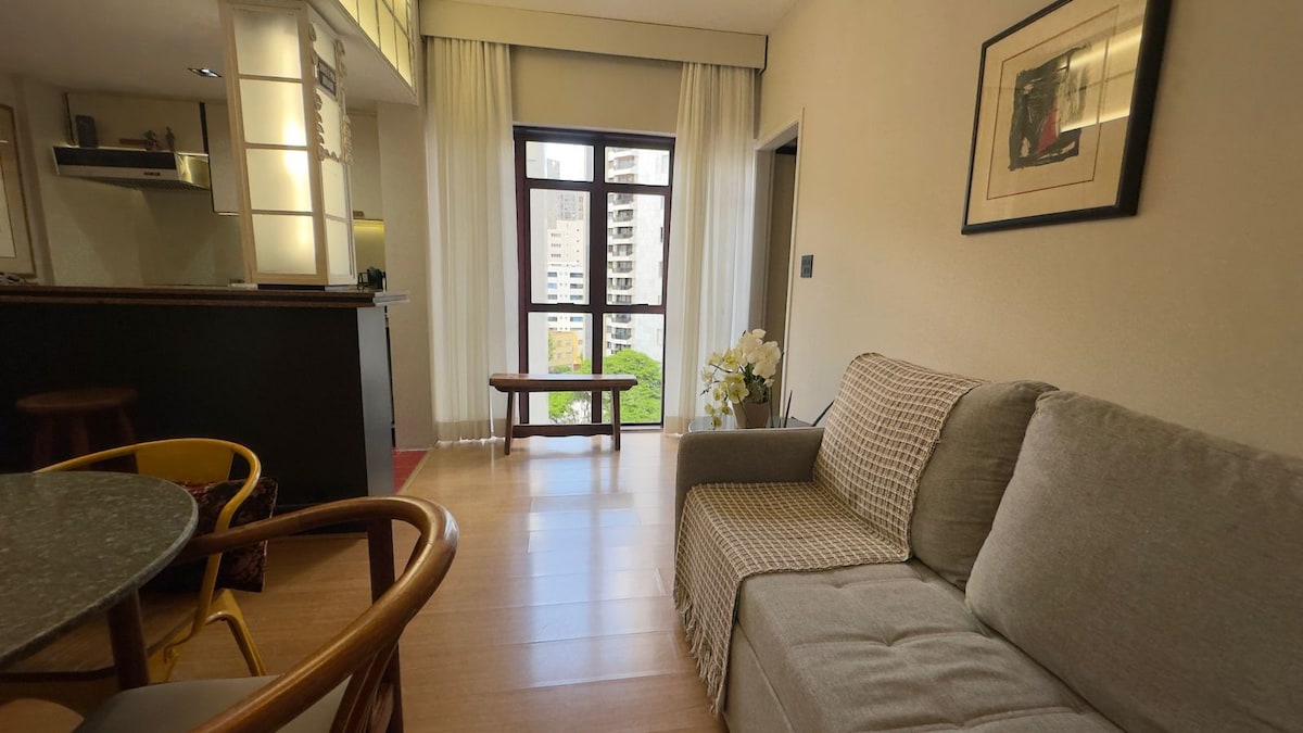 Apartamento moderno, 32m2, localizado no melhor ponto do Sion. Cozinha prática com frigobar, cooktop, TV (canais abertos/Netflix), ar condicionado, secador de cabelo, chaleira elétrica e internet. Zona Sul, ao lado da Praça JK e Avenida Bandeirantes, em frente a um Supermercado. Rooftop do prédio com academia, sauna, piscina, área de convivência e cozinha comunitária (água, máquina de gelo). Limpezas sob demanda disponíveis. Prédio seguro com portaria 24h. *Não há garagem inclusa.