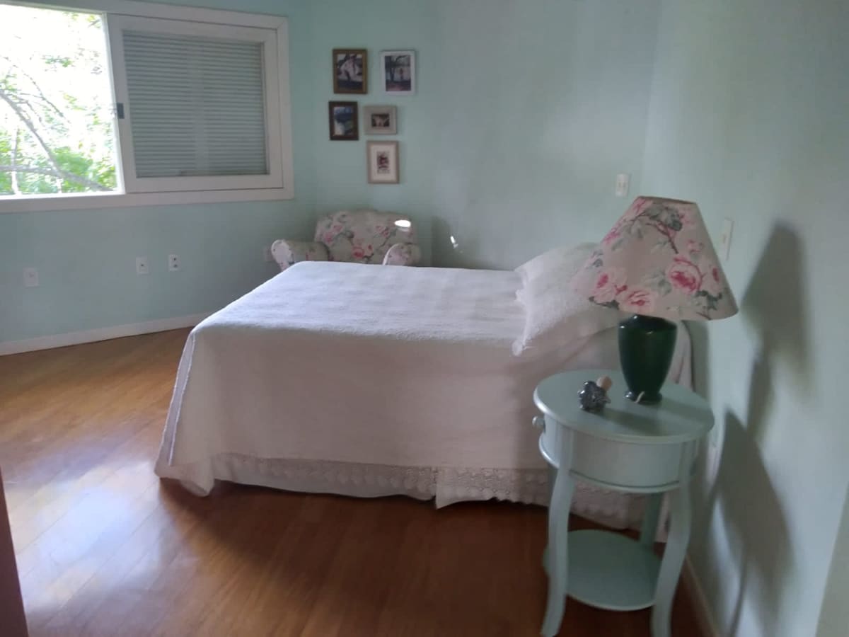 Venha curtir e passar dias relaxantes em meio a natureza. A casa fica situada no interior de Nova Veneza em meio a um vale dentro de uma reserva particular. Sem vizinhos por perto, a natureza ao redor é abundante, com vista para as montanhas e a bela cachoeira do sertãozinho, muito verde e pássaros, um laguinho com carpas coloridas, rios e cachoeiras a poucos passos. O lugar é lindo em todos os climas; banhos de rio e cachoeira no verão, lareira e fogão a lenha no inverno.