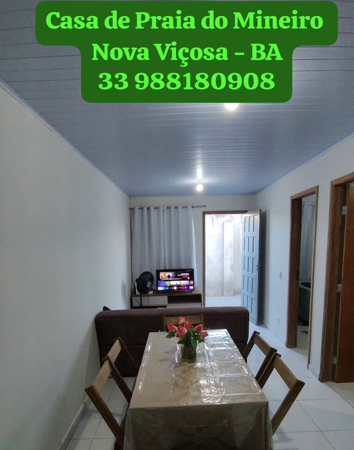 Casa de Praia: Aconchego - [Nova viçosa] 1. *Suite com ar condicionado*: Cama de casal, guarda roupa 2. *Quarto social*: 2 beliches, guarda roupa e ar condicionado 3. *Banheiro social*: Chuveiro quente e frio 4. *Varanda*: Mesa de madeira e bancos 5. *Sala*: TV, sofá confortável 6. *Cozinha*: Fogão, geladeira, micro-ondas, utensílios e louças. 7. *Área de serviço*: Máquina de lavar roupa e espaço para secar. 9. *Garagem*: Estacionamento privado para 3 carro.