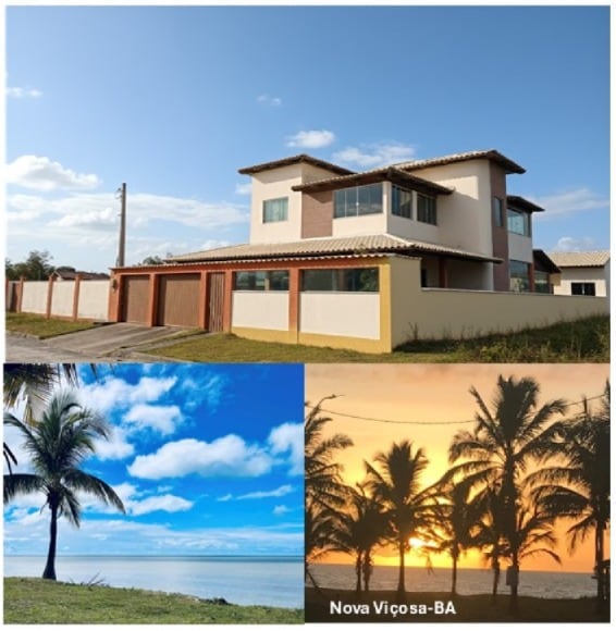 Casa térrea em terreno amplo, na quadra da principal praia de Nova Viçosa (PRAIA DO LUGAR COMUM), com 4 quartos, 3 banheiros, sala, cozinha recém-reformada e ampliada e ampla varanda/garagem.