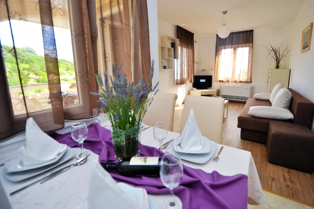 This unique apartment complex offers an exclusive 4-star two-bedroom apartment on the ground floor with: - restaurant with local specialties and traditional meals, - outdoor pool, - sauna, - fitness center, - massage area, - large barbecue area, - children playground, - sandy and pebble beach, - parking zone and more. Experience the true meaning of summer vacation, escape the city rush and let us spoil you with the comfort of our apartment, beach on location and breathtaking landscape.
