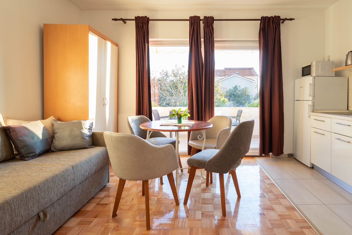 Modern luxury villa with swimming pool and sea-view. The villa has 5 modern furnished apartments for 6 persons with spacious terrace and beautiful sea view. Apartment features free wi fi, air conditioning and parking place. In the garden is nice pool (shared with other guests ) where guests can peacefully relax during the day. Villa is located on only few min by walk from the beach and not far from city center. Grocery and bus stop with directly lines to Zrce beach are next to the villa.