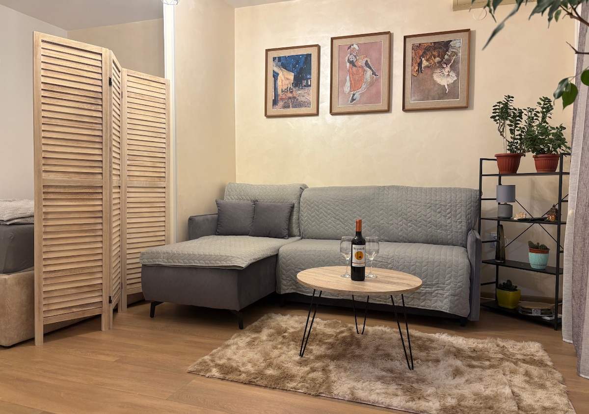 Welcome to our cozy studio located in Novi Sad in the historical area of Podbara. We are located in the very center of the city just between the pedestrian walking area and the Danube River embankment, which are not more than 3 minutes ' walk away. There are numerous coffee shops, restaurants, bars, pizzerias, as well as currency exchange offices, supermarkets and convenience stores. Public parking near the house (150 м) 95 dinars or 0.80 euro \ day. Paid by us.