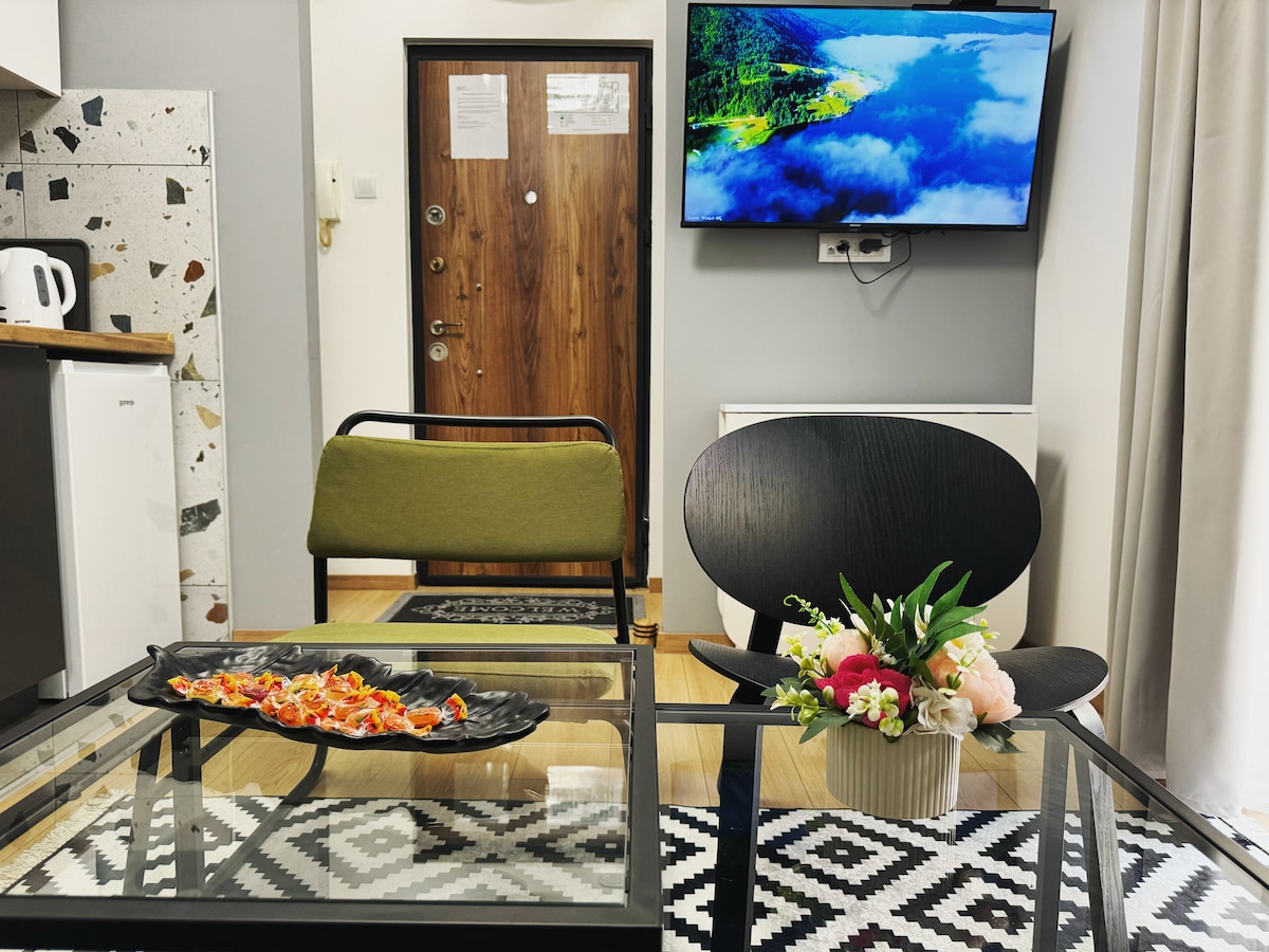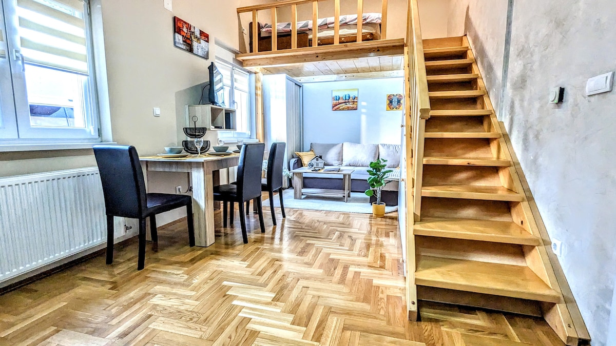 We believe that the location is at the top of the priority list for a vacation or business trip. Therefore, the main feature of this apartment is its location. We have managed to provide our guests with an apartment that is about a 5-minute walk from the city center, located in a very peaceful area. The apartment is 29m² +a gallery, and its design will not leave you indifferent. The apartment accommodates up to 4 people. A parking space, free fast Wi-Fi.