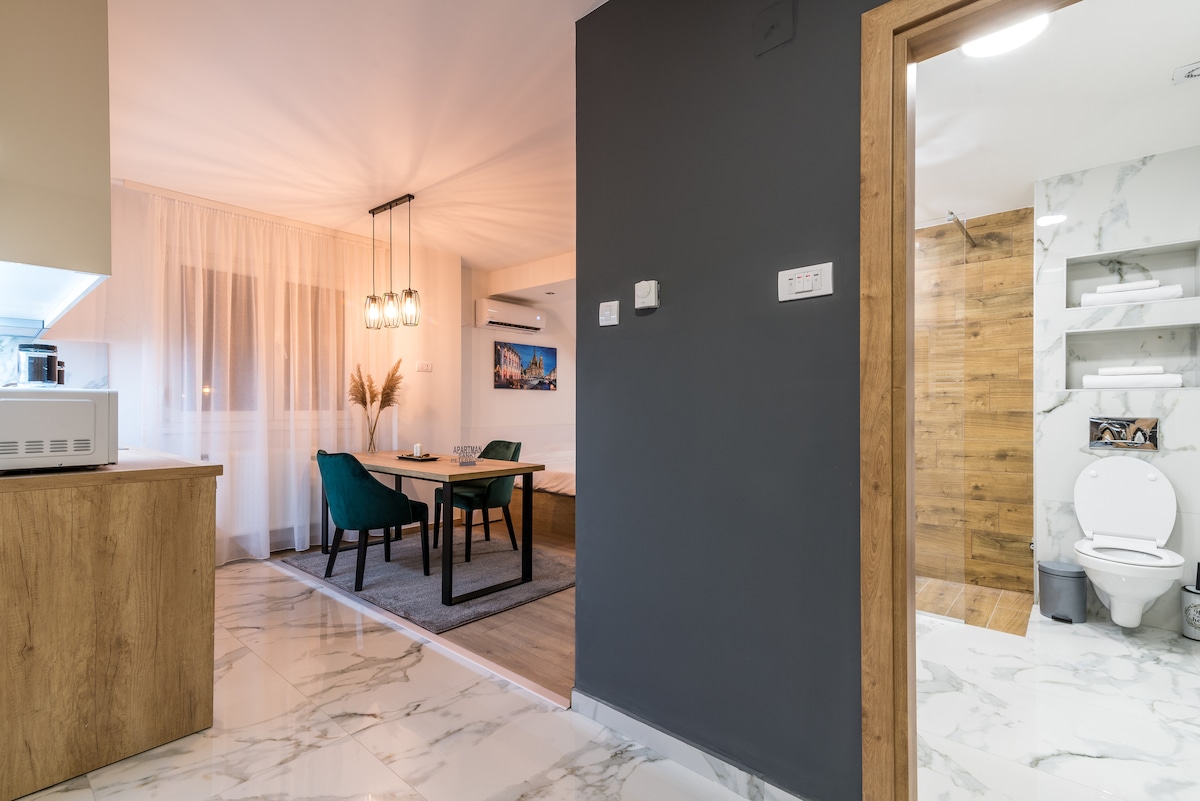 Experience Novi Sad’s charm in our enchanting apartment. Nestled in one of the oldest buildings, our space offers a glimpse into the past with modern amenities for your comfort. Spacious and beautifully designed, the apartment includes a sauna for ultimate relaxation. Situated in the main pedestrian zone, immerse yourself in the city’s sights, sounds, and flavors. Whether for business or pleasure, our apartment is your perfect home away from home.