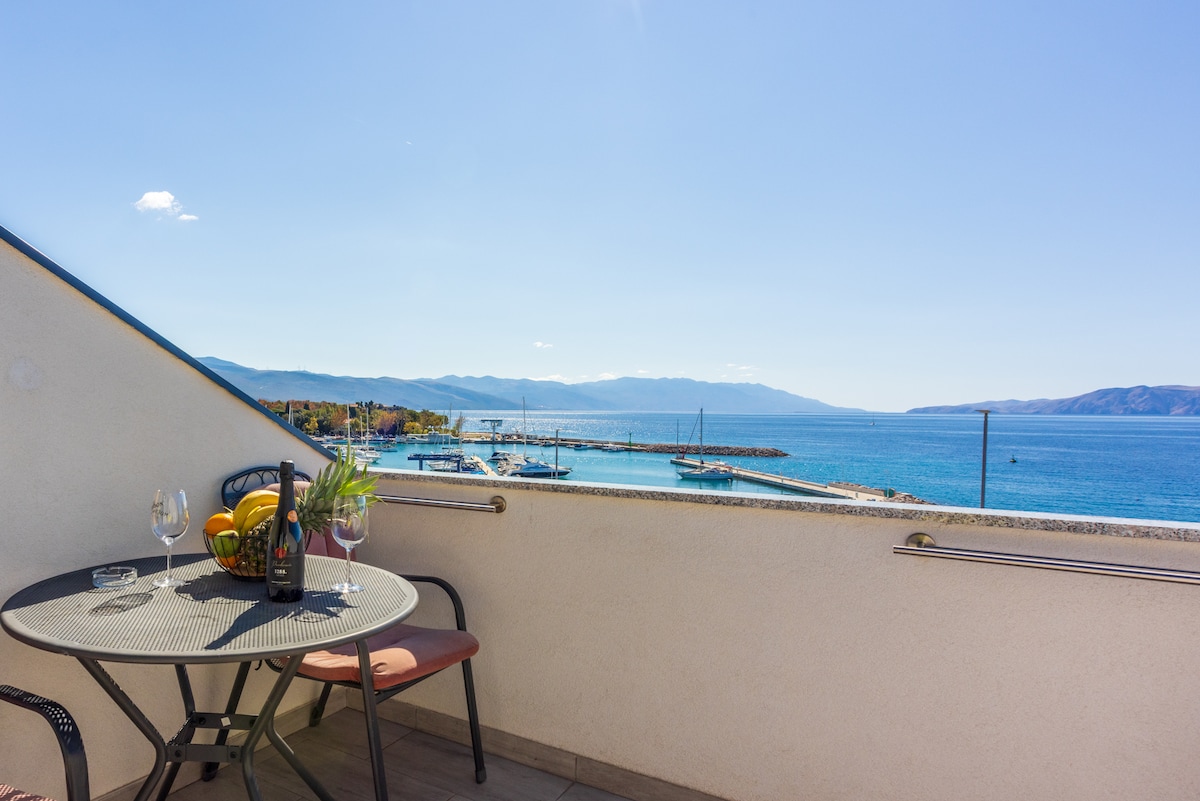 Our sea view over the marina invites you to spend your days and evenings on the balcony - overlooking the sparkling waters of the infinity pool and the Adriatic Sea. Whether it's a glass of wine or a Coke, a game of Uno or the latest novel, you'll immediately feel that you're on vacation. And if you feel like going to the beach: It's just a ten-minute walk to the Novi Vinodolski Riviera. By the way: Novi Vinodolski means "New Wine Valley" - just ask our award-winning winemaker