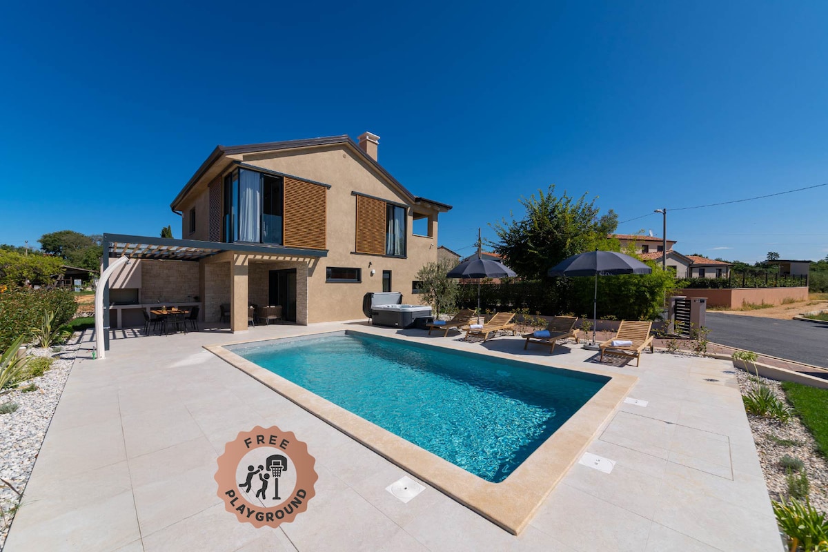 Luxury apartment GioAn, in Novigrad, 7 minutes walking distance from the beach, close to the city center and all facilities such as supermarket, pharmacy, fish market, restaurants.. 2 bedrooms, bathroom, living room (with sofa bed), fully equipped kitchen (microwave, blender, espresso machine, oven, dishwasher, toaster, kettle, fridge, freezer, wine fridge), front covered terrace (with all el. blinds) with outdoor kitchen, BBQ area, private heated Jacuzzi. *BREAKFAST IS OPTIONAL (EXTRA SERVICE)