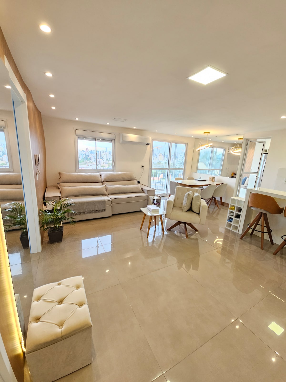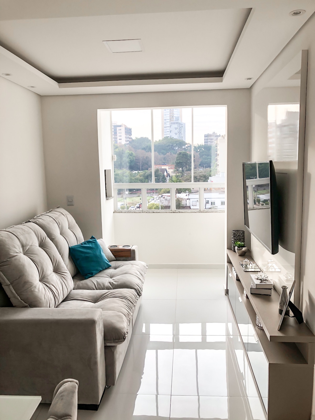 Apto novo com 68m² amplo e moderno, com 1d, sala de estar grande e aconchegante com tv de 65", cozinha toda equipada, ampla sacada gourmet com churrasqueira e uma vista incrível, mobiliário de alto padrão proporcionando muito conforto aos hóspedes, garagem coberta, piscina, playground e quiosques com churrasqueira, em ótima localização, uma quadra da BR116, frente p o Hotel Ibis, fácil acesso à Porto Alegre(aeroporto) e a serra gaúcha, 5min do centro, Fenac, Shopping Outlet e Bourbon, Trem.