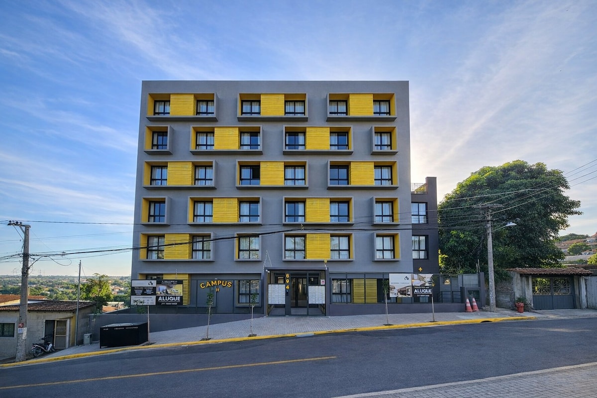 Modern Studio | Near Feevale – NH Fully equipped, highly functional studio—perfect for studying, working, or enjoying the city. Open-plan layout with double box bed, sofa, TV, and integrated home office. American kitchen with cooktop, microwave, fridge, and multifunctional counter—ideal for quick meals or studying. Building features an open-air lounge, eco-friendly fireplace, chimarródromo, gym, bike storage, and pet area.