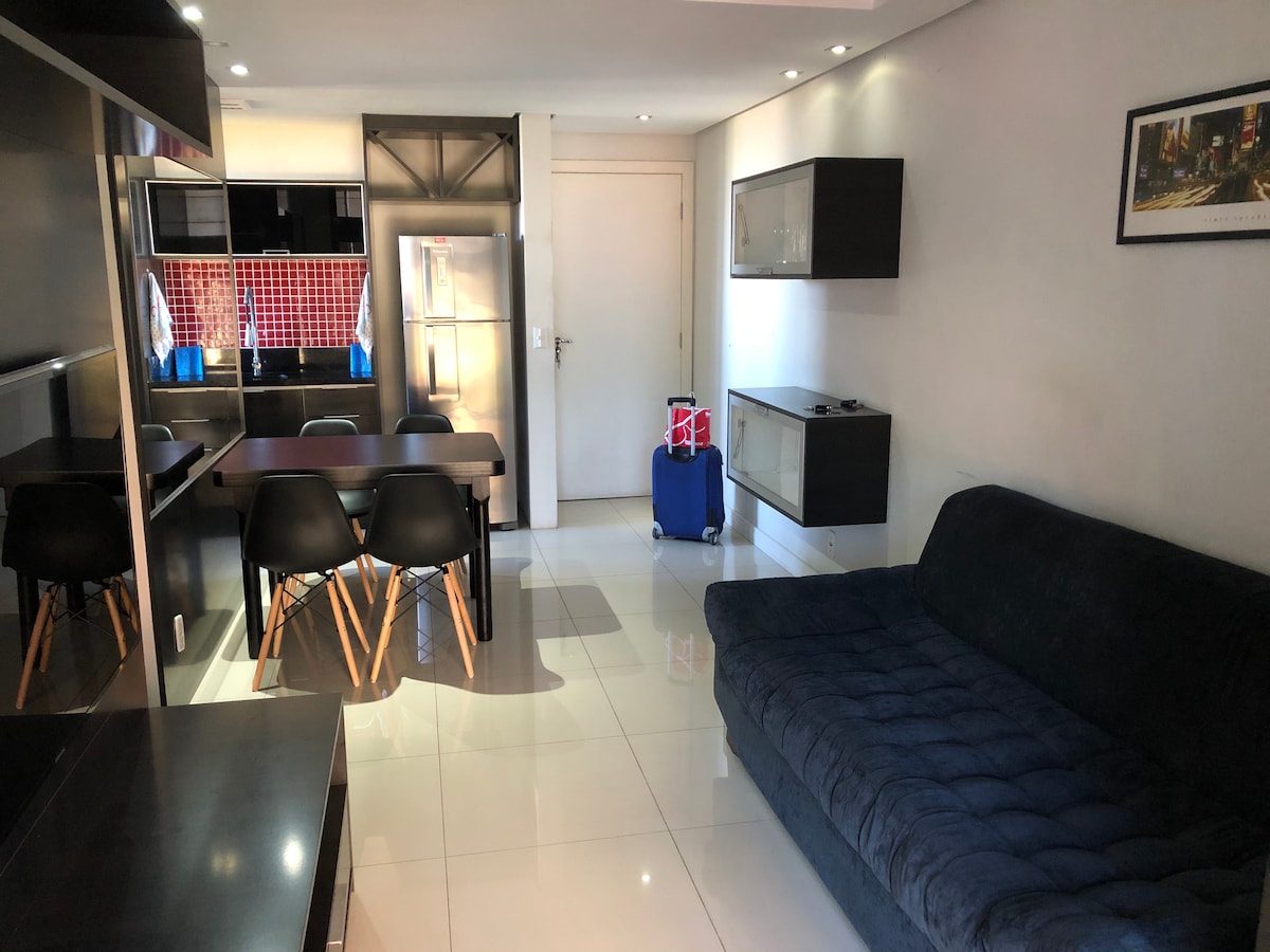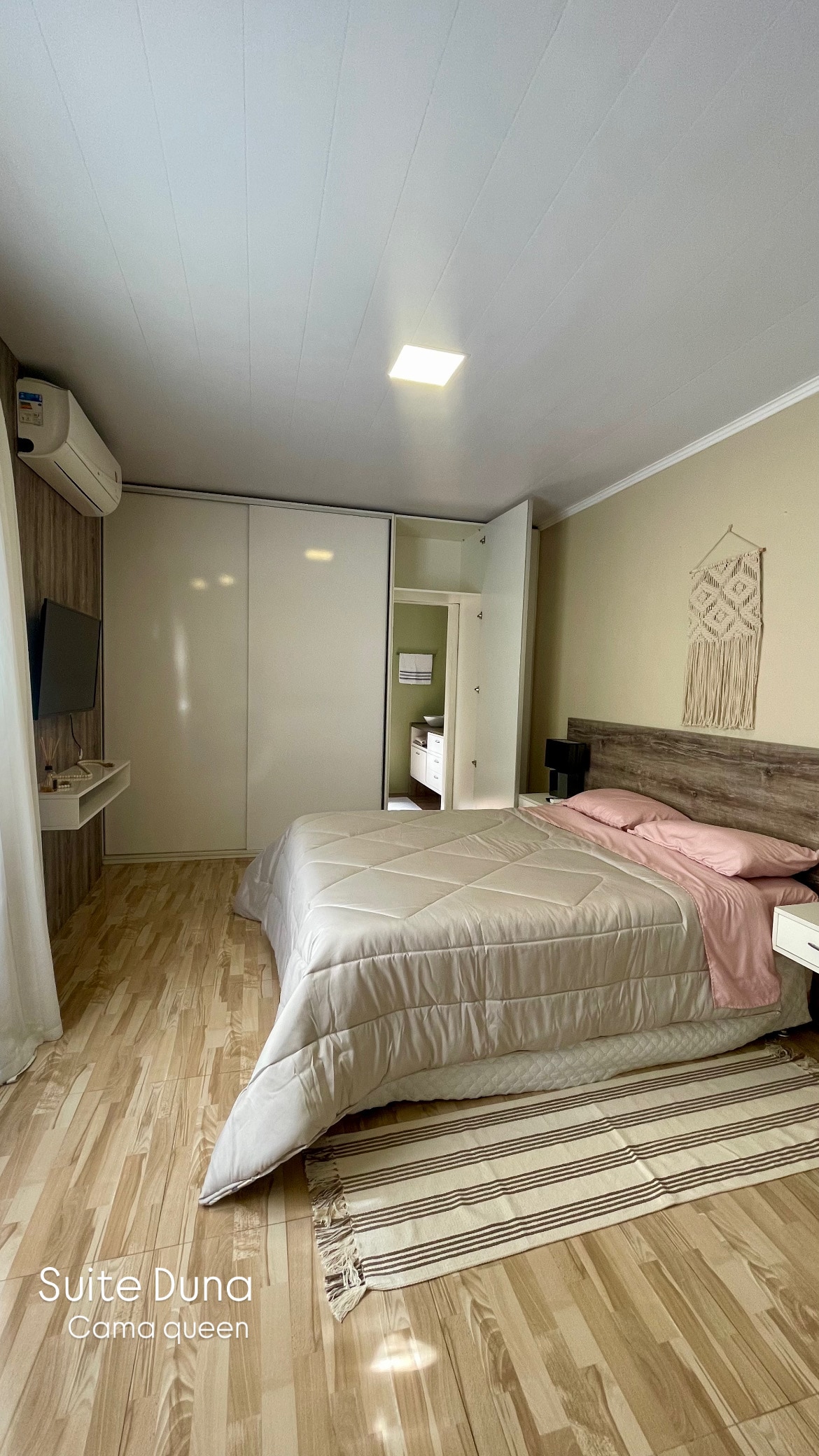 Amplo apartamento de 2 dormitórios, com lareira e um lindo pôr do sol! Possui cozinha completa, máquina lava e seca e eletrodomésticos para facilitar a tua estadia. A sala e o quarto possuem ar condicionado, e o apartamento é naturalmente bem ventilado, iluminado e ensolarado. A sacada possui churrasqueira e uma linda vista do pôr do sol ao final da tarde. Conta com 2 vagas de estacionamento em frente ao bloco (não cobertas), além de portaria 24 horas. Condomínio seguro e super tranquilo.