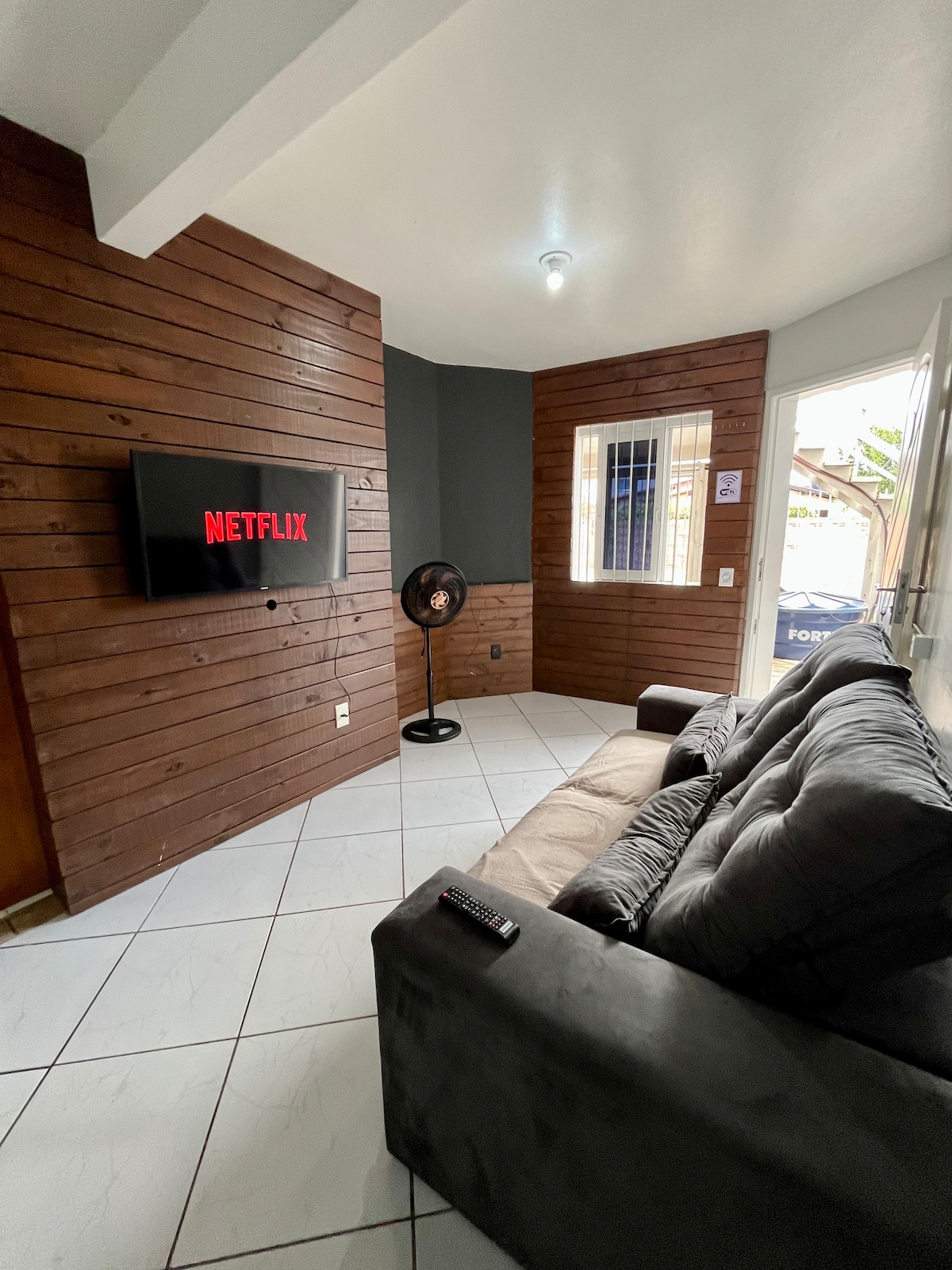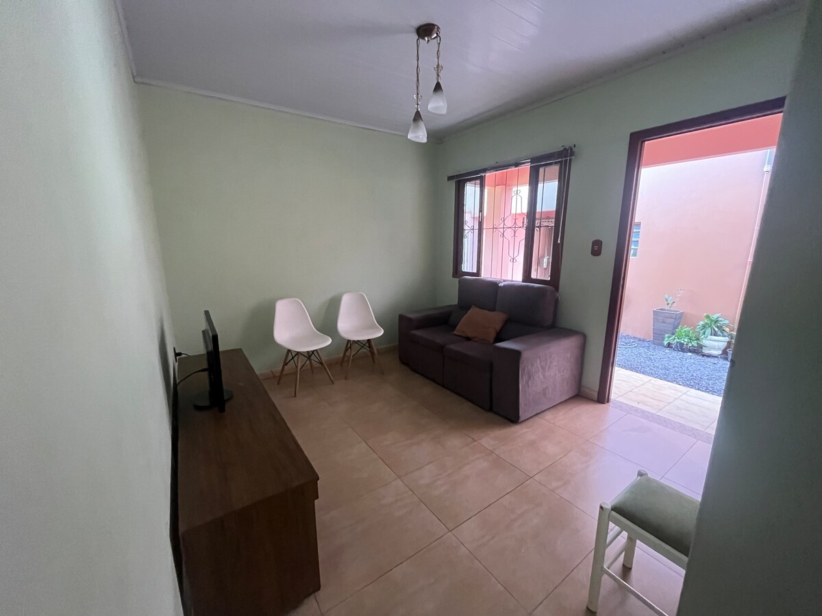 Abrace a simplicidade neste lugar tranquilo e bem-localizado, 5 min do centro de Novo Hamburgo e da BR116. Casa com conceito aberto que conta com um quarto com cama de casal, roupeiro, ar quente e friu 18mil btus pra casa inteira, sala com sofá cama, TV Smart(Roku), Wifi, cozinha completa com geladeira, fogão, microondas, cafeteira, jarra elétrica, utensílios de cozinha, máquina lava e seca, banheiro completo, secador de cabelo, área externa com pátio com gramado e garagem aberta para carro.