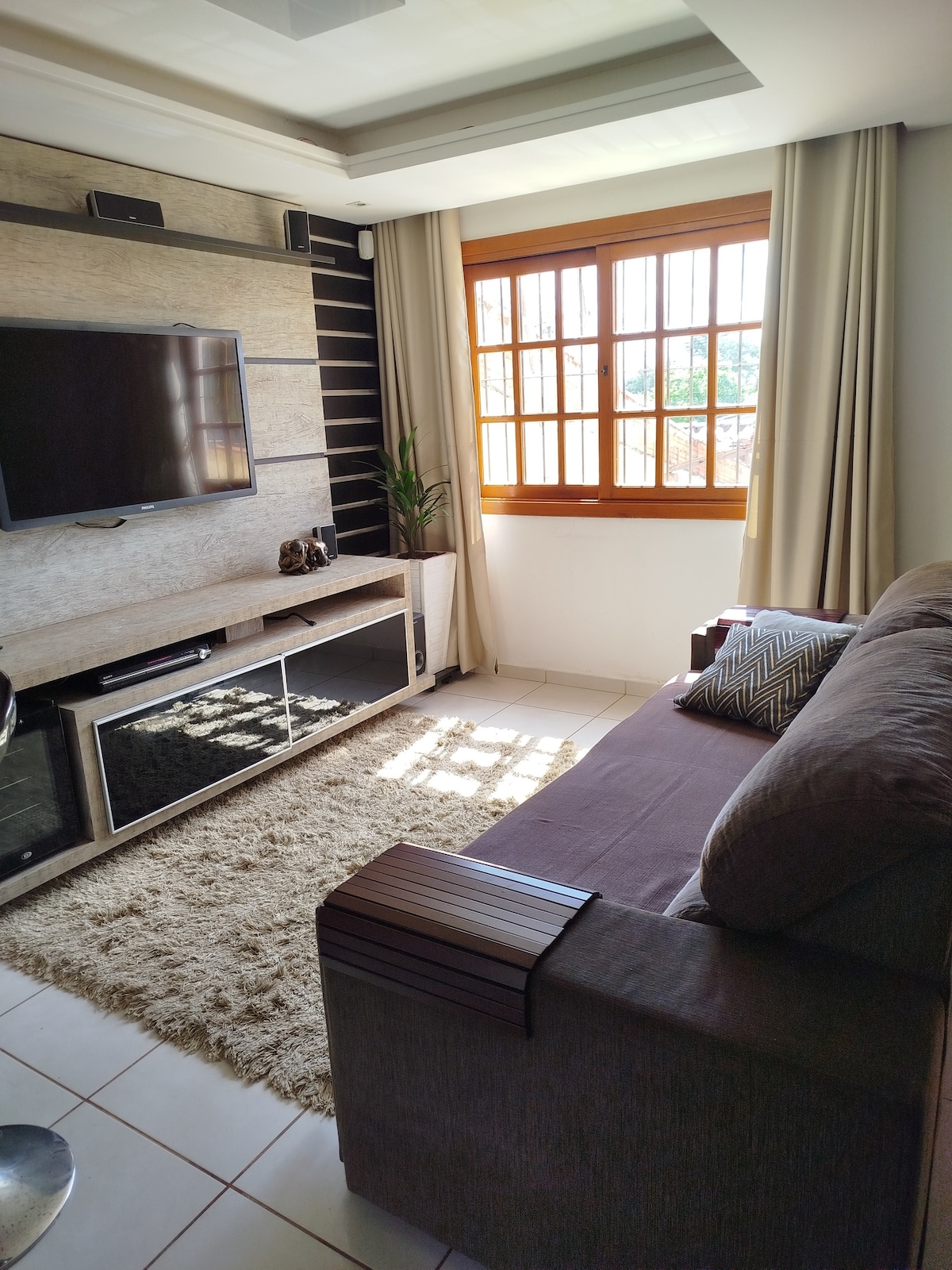 Apartamento amplo e aconchegante, com Ar Condicionado nos dois quartos. Vista da sacada para o pôr do sol, com 2 dormitórios, cozinha e lavanderia completas. TV e Wi-Fi. Casa com 3 andares. Fica no terceiro andar. 2 lances de escada. Moramos no primeiro andar. Próximo à BR 116, a 3 min do centro, 3km da fenac e 5km da feevale. Bairro bonito, residencial, calmo e muito seguro. Quarto de casal com cama queen e sacada. Outro quarto com 2 camas de solteiro. 1 banheiro grande.