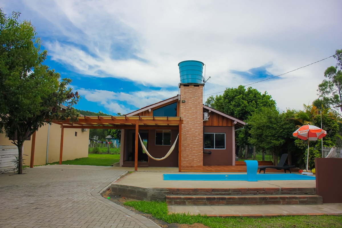 Ampla casa, com 4 quartos, lareira interna, churrasqueira, fogão a lenha, piscina e pergolado. Situado em zona rural com apenas 50 km de distância de Porto Alegre. Também está disponível para pequenos eventos, durante o dia, para até 40 pessoas.