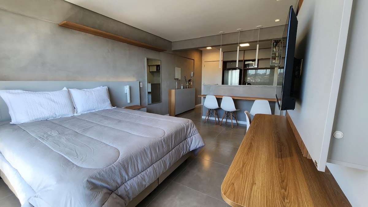 Studio novo e moderno no 13º andar, pensado para oferecer conforto e praticidade. Decoração minimalista e aconchegante, é ideal para casais, viagens a trabalho ou lazer. Localização é um diferencial: no centro de Novo Hamburgo, pertinho da FENAC, hipermercado Bourbon, shopping, estação de trem e rodoviária. Apenas 40 min de Porto Alegre e 1h30 de Gramado. Aqui você encontra tudo para uma estadia completa. Sinta-se em casa!✨