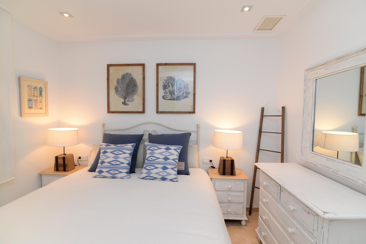 Modern ground floor apartment with access to a private fenced garden in the best area of Novo Sancti Petri (Cádiz in the South of Spain). Surrounded by Golf Courses and 5 minutes from the beach. Impressive sights. Newly renovated. 2 bedrooms and 2 bathrooms, one in suite. Ideal for teleworking or Golf Holidays. We have a cot and a highchair for families. Large common gardens and swimming pools. Air conditioning (cold+hot) throughout the house + wifi to be able to telecommute.