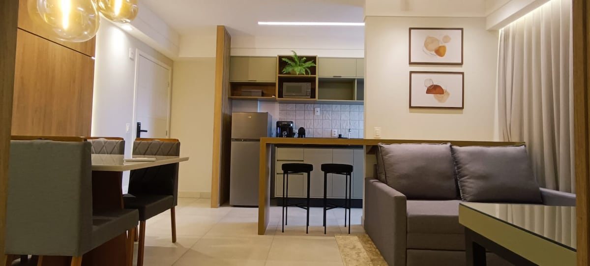 Apartamento moderno e completo, em andar alto, numa ótima localização em Ribeirão Preto (Jardim Botânico). Ambiente com ar condicionado, equipado com os utensílios necessários para a estadia, mobiliado e decorado. Sala com sofá-cama e SmartTV. Prédio bem localizado, de acesso fácil às principais avenidas da cidade, além de contar com piscina, área de lazer, academia e sala de reuniões.