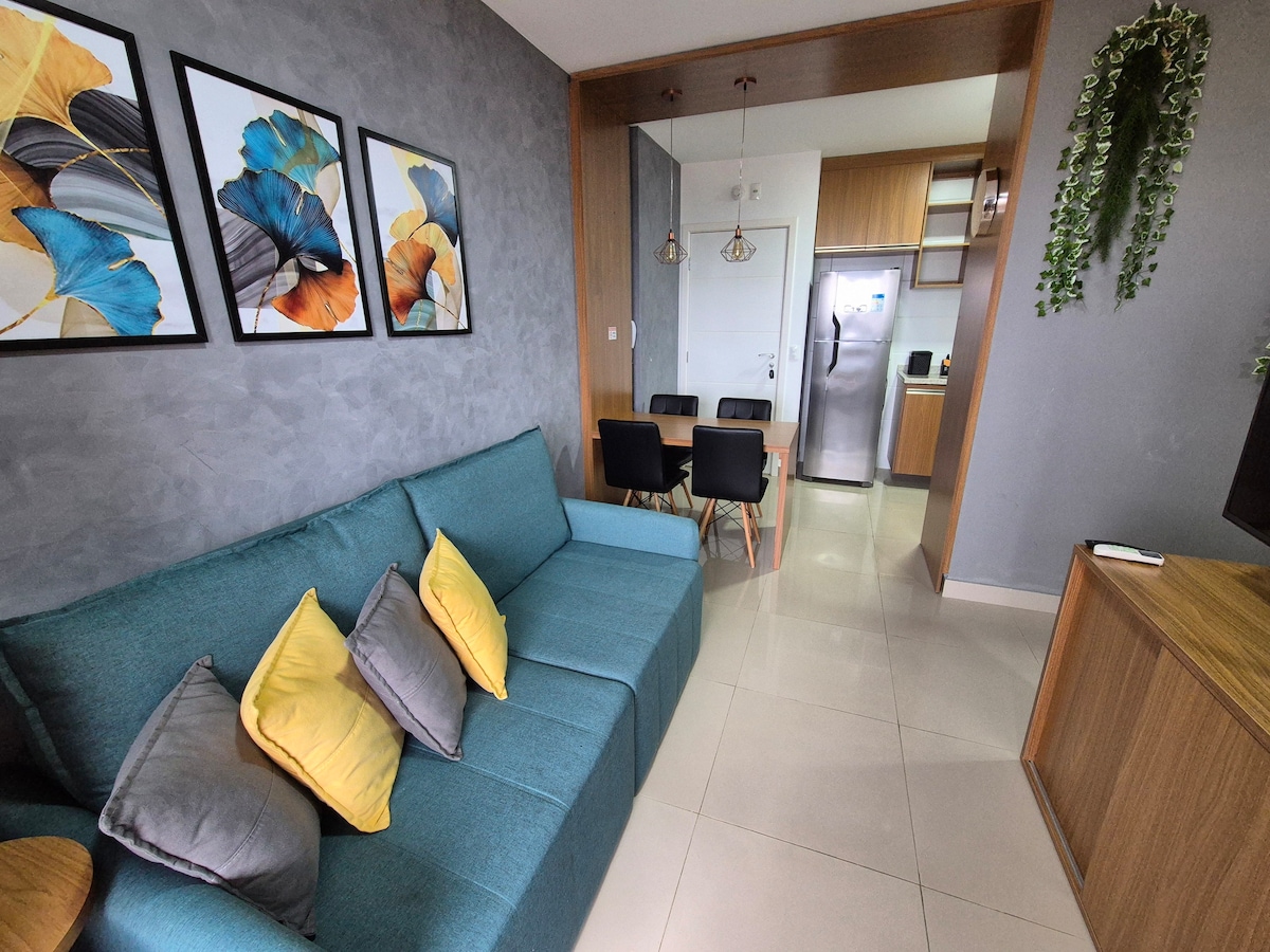 Para se sentir em casa! Possui geladeira, bebedouro, micro-ondas, air fryer, cooktop, TV 42", ar condicionado, sofá cama, cama de casal, armário, mesa de jantar, mobília e utensílios novos. Está disponível uma vaga na garagem, elevadores social e de serviço, piscina, sauna, academia, área de churrasco, salão de festas e jogos e lavanderia. Localizado a 500m do shopping. Posto de combustível e farmácia localizados ao lado e loja de bebidas, roupas, manicure e café no térreo do prédio