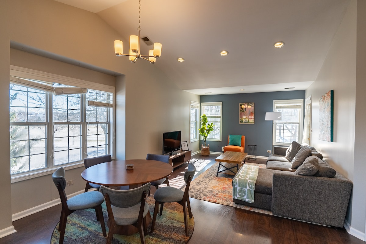 The modern lagoon is an entire townhouse with 3 br with 1 king , 2 queen and a sofa bed, private entrance with a homely feel. 1 car garage, 1 car driveway with plenty of parking for visitors. You are 25 mins away from O'Hare Airport and 35 mins from the epic downtown Chicago area. Staying local? There is plenty to do! 10 mins away from the NOW Center Arena, 10 mins from Woodfield Mall, and mins from the Arboretum, Main Event and more. Short Term welcomed. Key pad entry, make yourself at home !