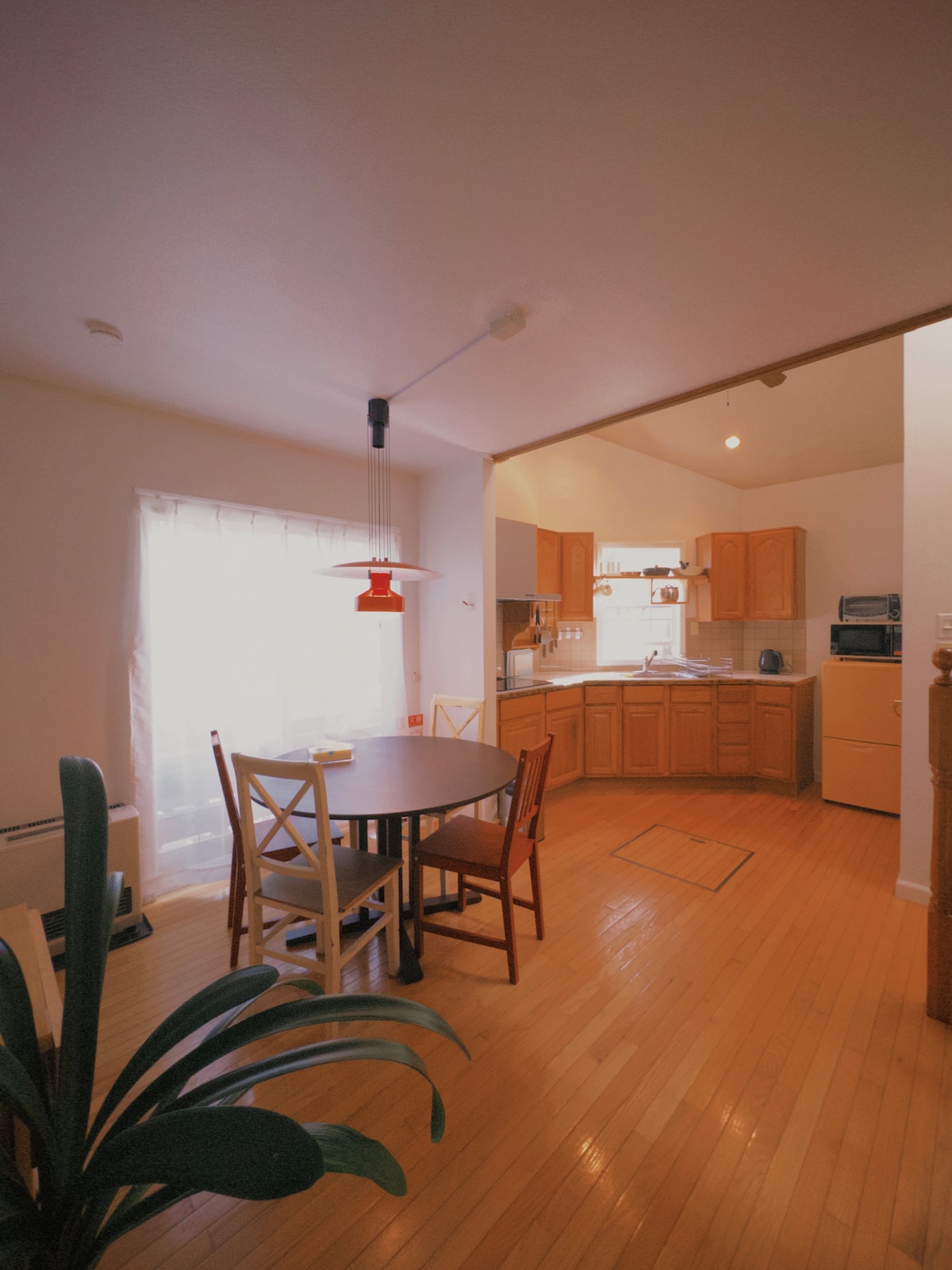 窓の外は、10キロ以上先まで何もなし。田んぼが一面に広がり、日本百名山のひとつ巻機山(標高1,967m)が真正面に位置します。タイミングがあえば、満月がそこから昇ります。 絶景の中で、田んぼを渡る風を感じながら、ゆったりとお過ごしいただけます。 春先は水が張られた田んぼが鏡のようになり、夏は緑、秋には黄金色。10月も後半になれば巻機山のてっぺんが雪に覆われ、中腹は紅葉に彩られます。そして冬は2m前後の雪に覆われます。 裏の田んぼでは無農薬手作業での米作りをしており、滞在中に参加していただくことも可能です。 WiFi完備。お仕事をしていただくスペースもあります。 自炊も可。徒歩20分(1,600m以内)に居酒屋、飲食店、コンビニがあります。地下に普通乗用車1台分の駐車スペースあり。