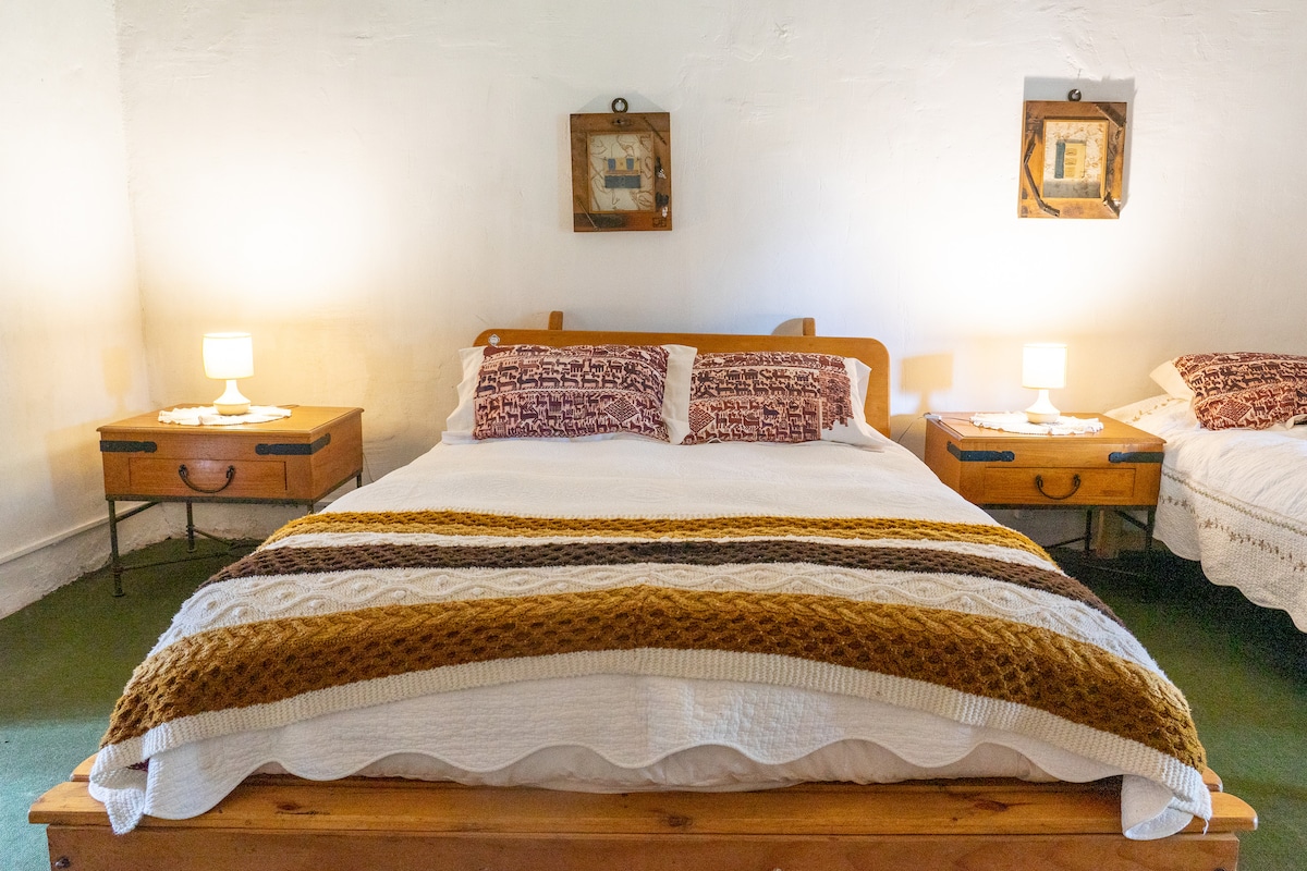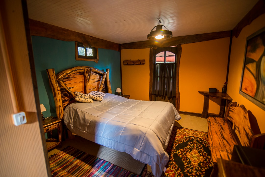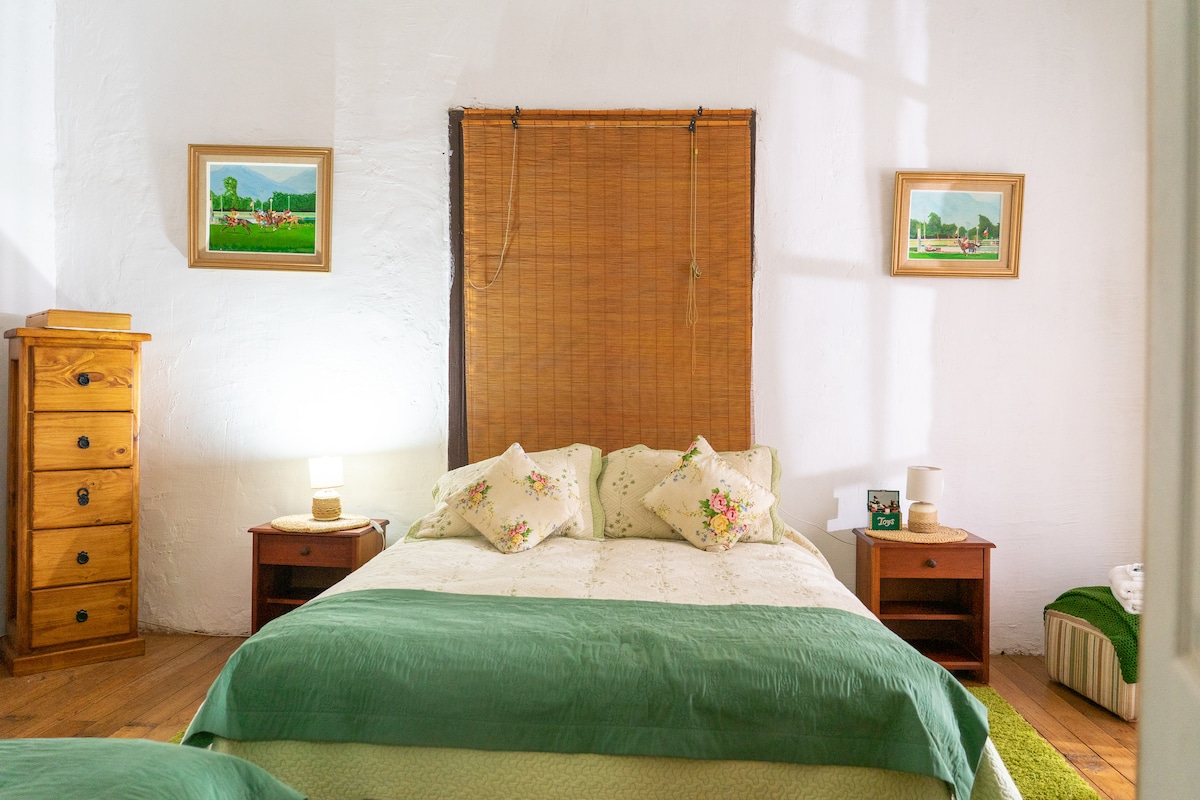 Encantadora habitación doble matrimonial en una casona colonial, con estufa a combustión lenta y baño privado en suite. Vista a jardines, piscina y corredor posterior. Incluye desayuno y acceso a quincho, piscina, corredores y amplios jardines. A solo 1,5 km de la Ruta 5.
