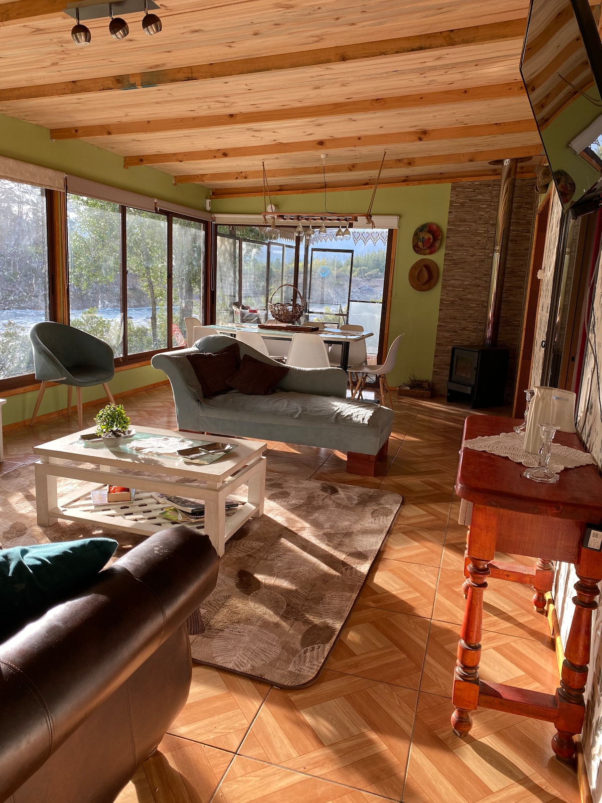 A orilla del río Ñuble, con una vista increíble, en 5.000 metros y bosque. La casa elegante, espaciosa y equipada te harán pasar unos días increíbles. El exterior, con piscina inmersa en el bosque hace una experiencia única. Toda esta maravilla a solo 7 minutos de pueblo, donde encuentras supermercados, tiendas, farmacia, artesanía, restaurantes, atención de Salud, etc. También puedes disfrutar de rafting, kayak, trekking, cabalgatas y mucho más !